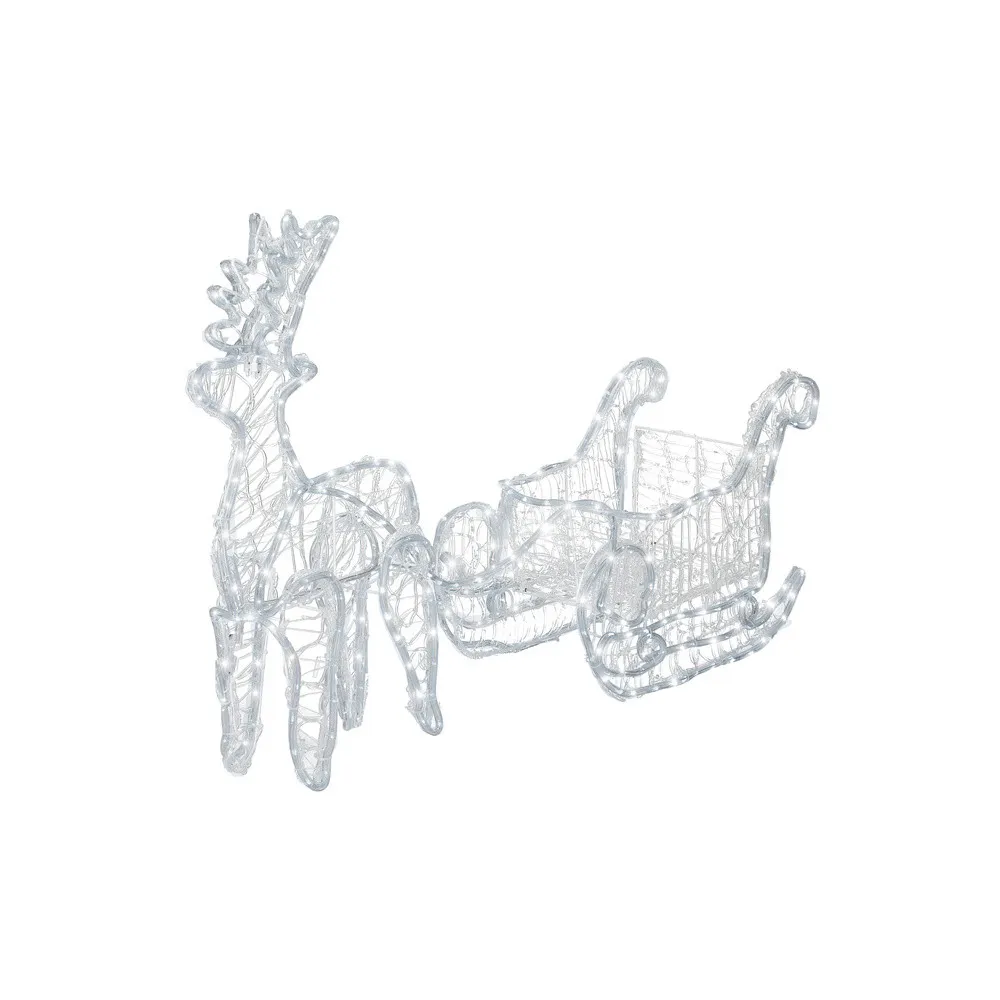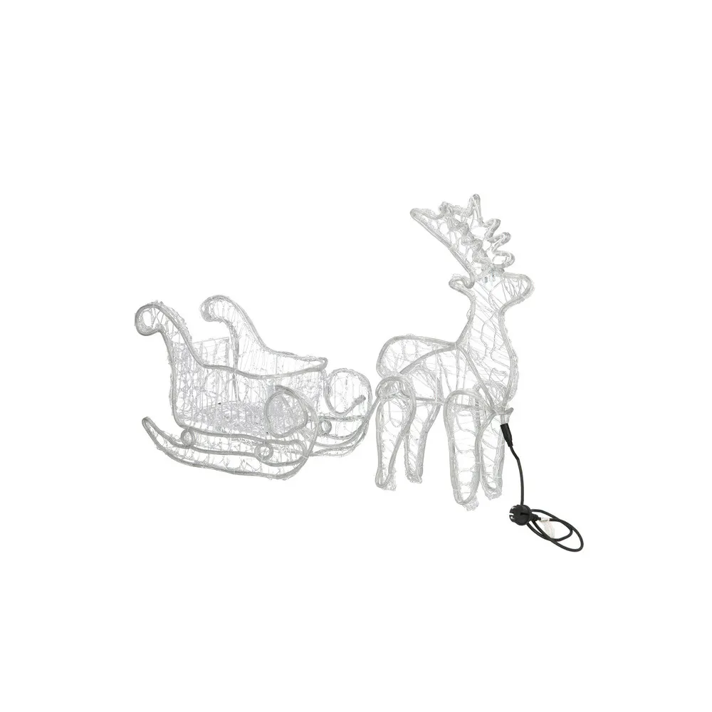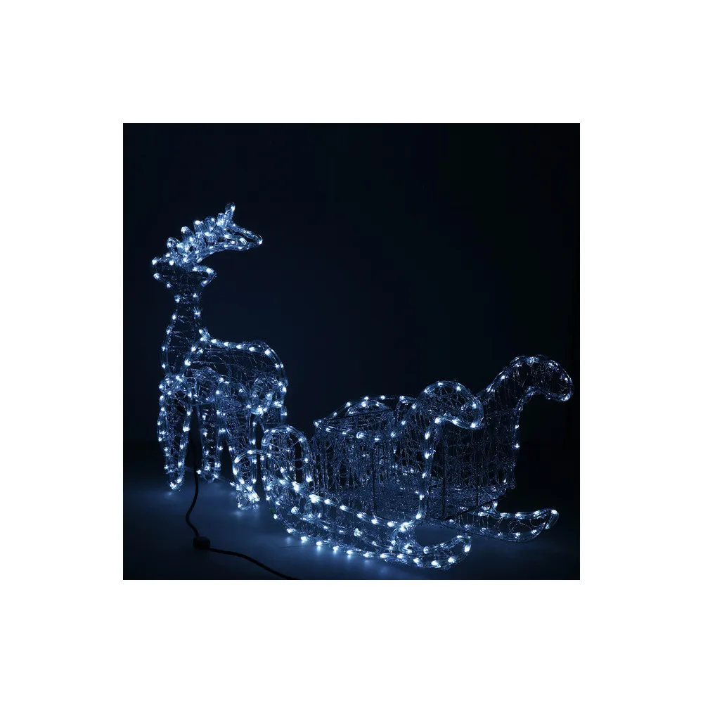 Majestátny sob so saňami, vysokým parožím a konštrukciou zdobenou výpletom. Úžasná 3D svetelná dekorácia vhodná pre vnútorné aj vonkajšie použitie, vodeodolné prevedenie, krytie IP44. Úsporné diódy, farba studená biela. Dĺžka 150 cm, 312 LED, napájací kábel 2 m.