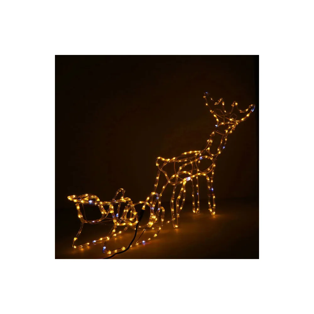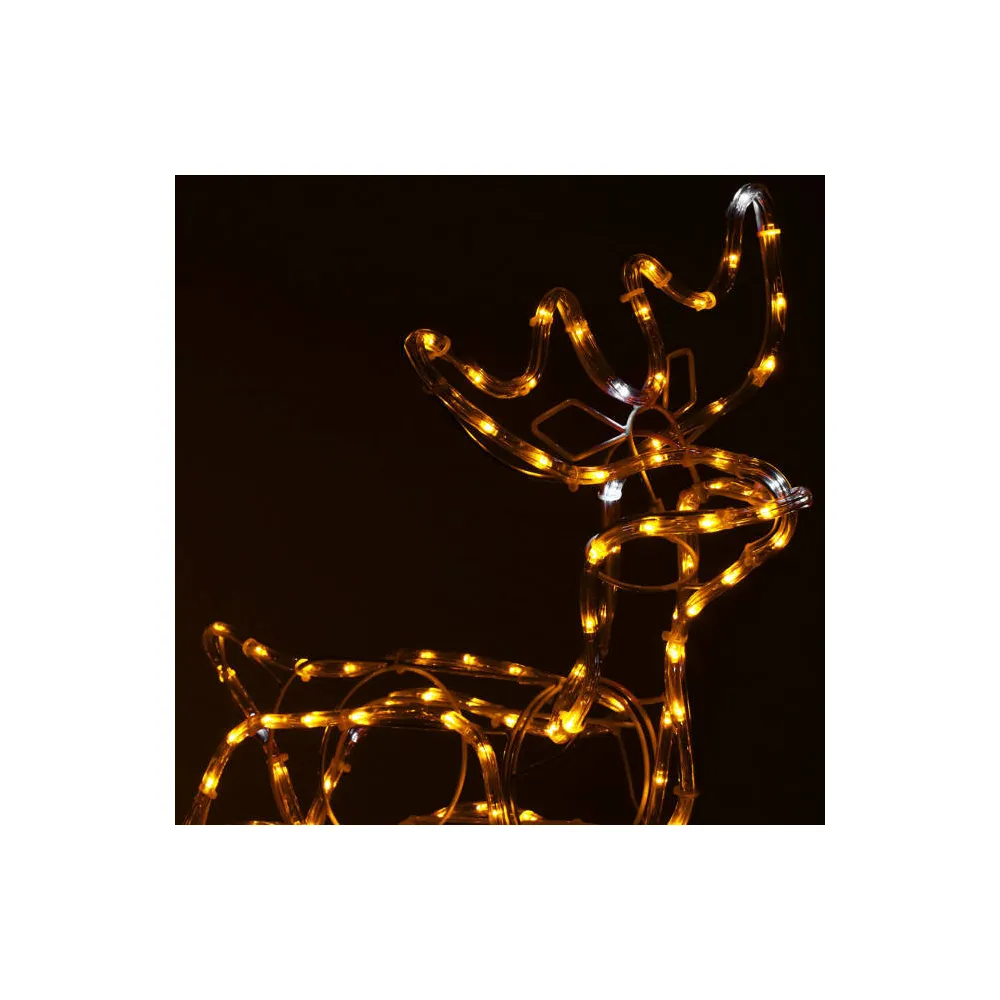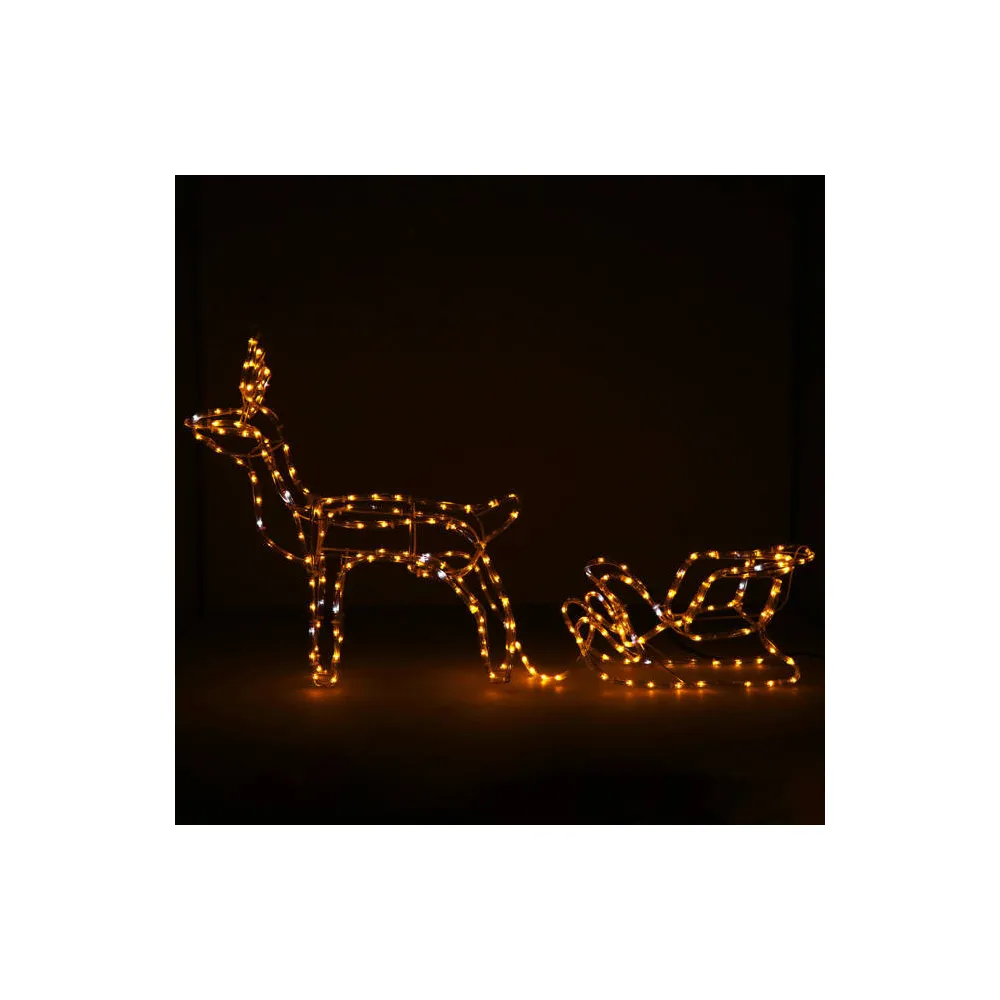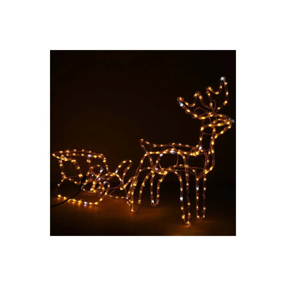 Prekrásny sob so saňami, vztýčenou hlavou, mohutným parožím a efektnými zábleskami modrej farby . Úžasná 3D svetelná dekorácia vhodná pre vnútorné aj vonkajšie použitie, vodeodolné prevedenie, krytie IP44. Úsporné diódy, farba teplá biela + záblesky modrá. Dĺžka 150 cm, 264 LED, napájací kábel 2 m.