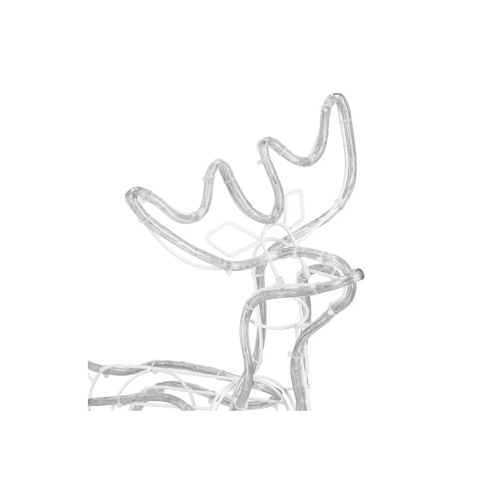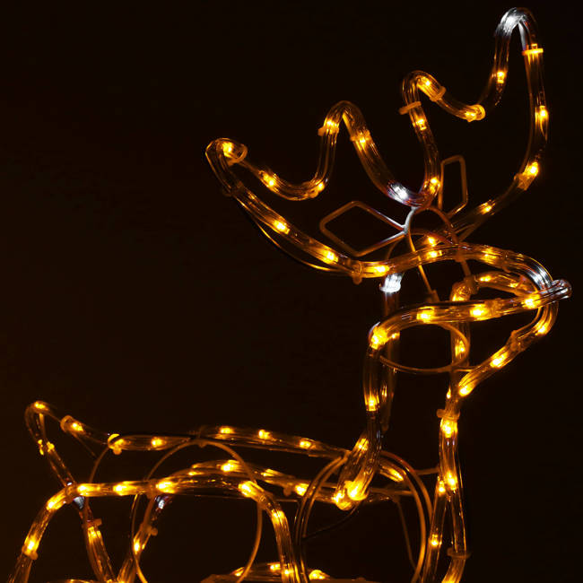Prekrásny sob so saňami, vztýčenou hlavou, mohutným parožím a efektnými zábleskami modrej farby. Úžasná 3D svetelná dekorácia vhodná pre vnútorné aj vonkajšie použitie, vodeodolné prevedenie, krytie IP44. Úsporné diódy, farba teplá biela + záblesky modrá. Dĺžka 150 cm, 264 LED, napájací kábel 2 m.