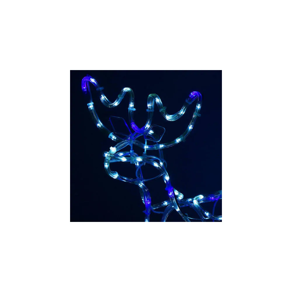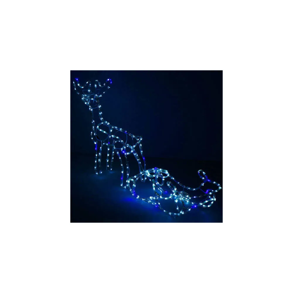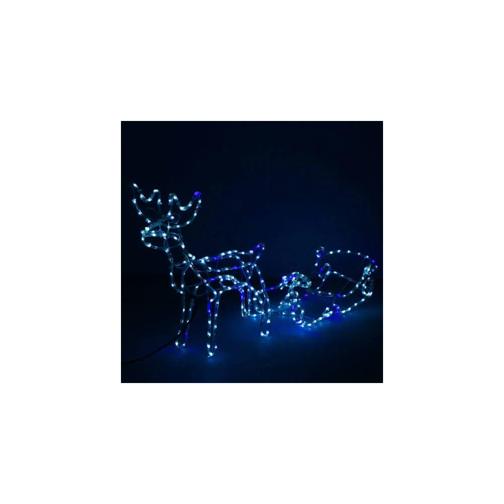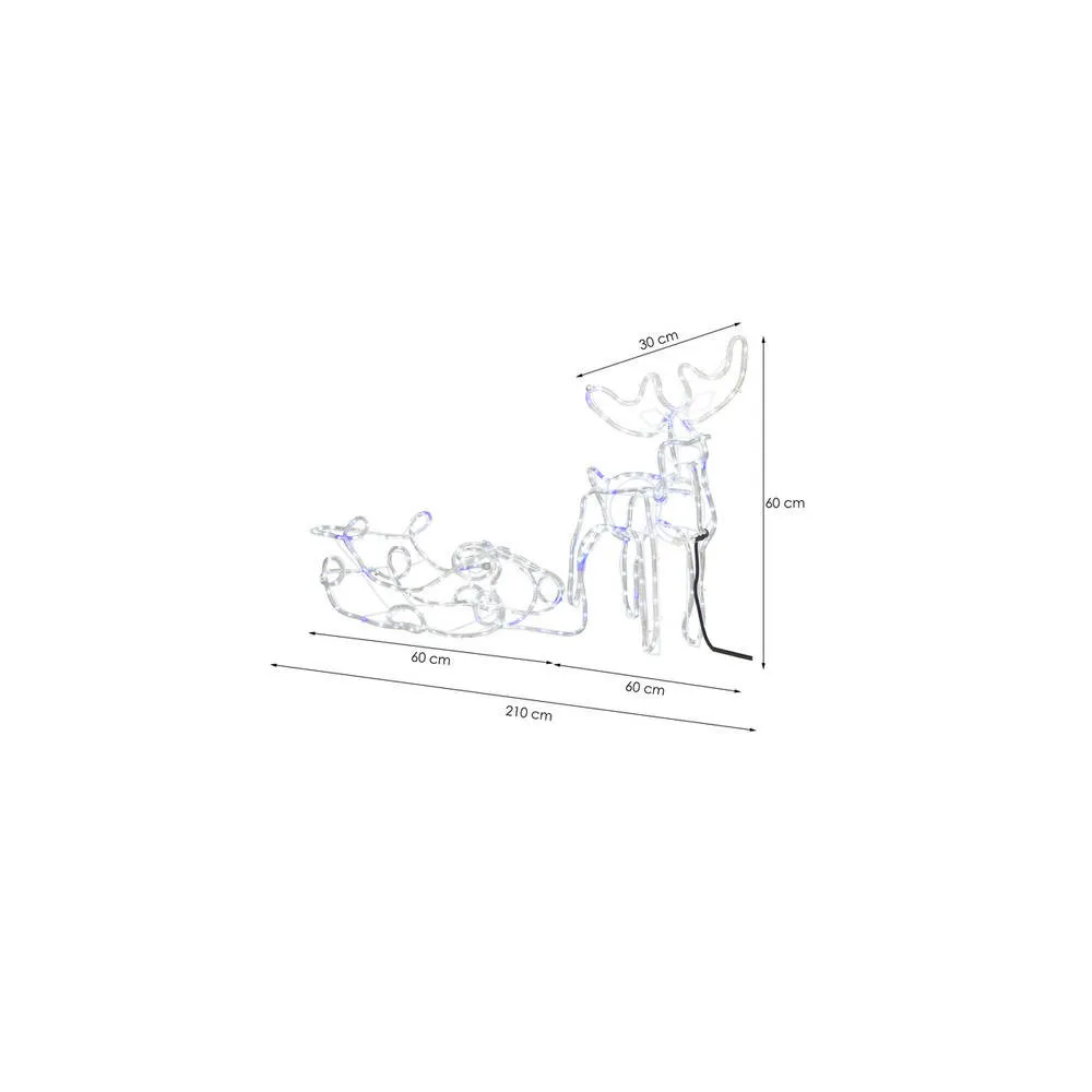 Prekrásny sob so saňami, vztýčenou hlavou, mohutným parožím a efektnými zábleskami modrej farby . Úžasná 3D svetelná dekorácia vhodná pre vnútorné aj vonkajšie použitie, vodeodolné prevedenie, krytie IP44. Úsporné diódy, farba studená biela + záblesky modrá. Dĺžka 210 cm, 288 LED, napájací kábel 2 m.