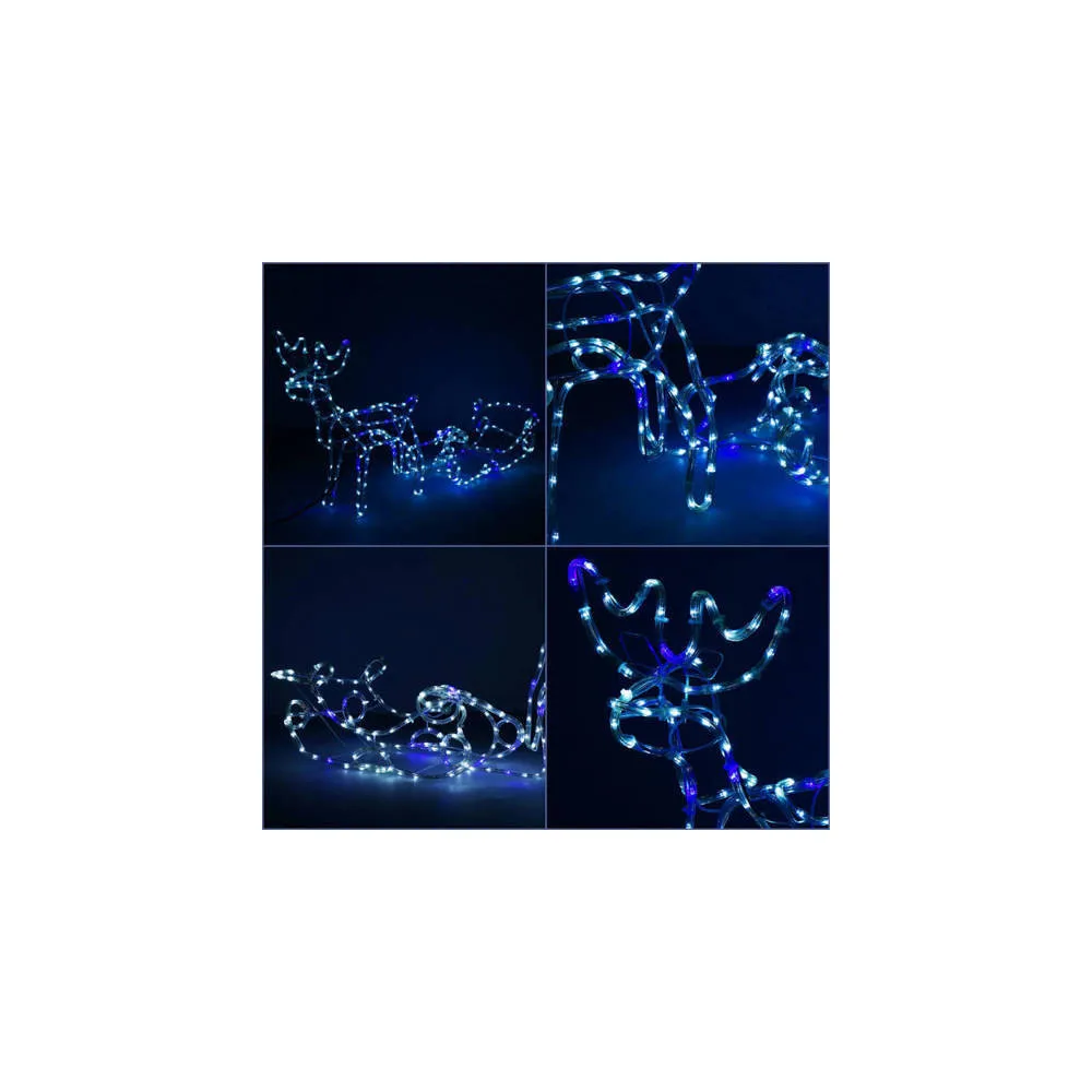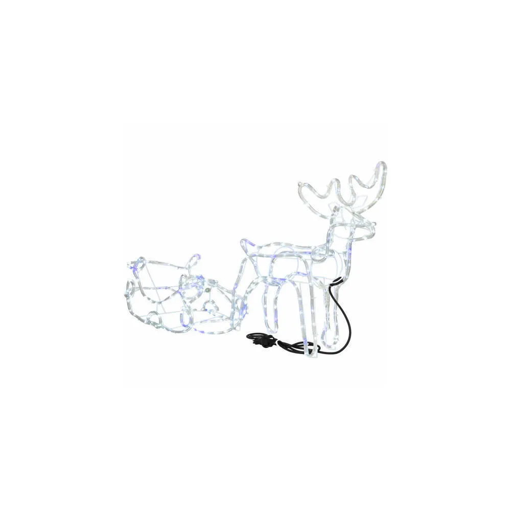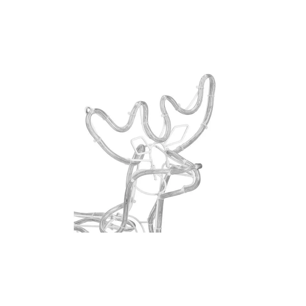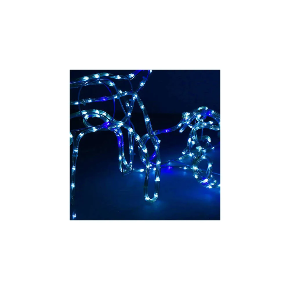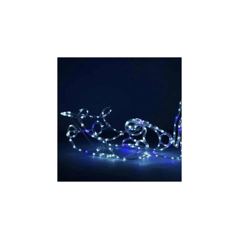 Prekrásny sob so saňami, vztýčenou hlavou, mohutným parožím a efektnými zábleskami modrej farby . Úžasná 3D svetelná dekorácia vhodná pre vnútorné aj vonkajšie použitie, vodeodolné prevedenie, krytie IP44. Úsporné diódy, farba studená biela + záblesky modrá. Dĺžka 210 cm, 288 LED, napájací kábel 2 m.