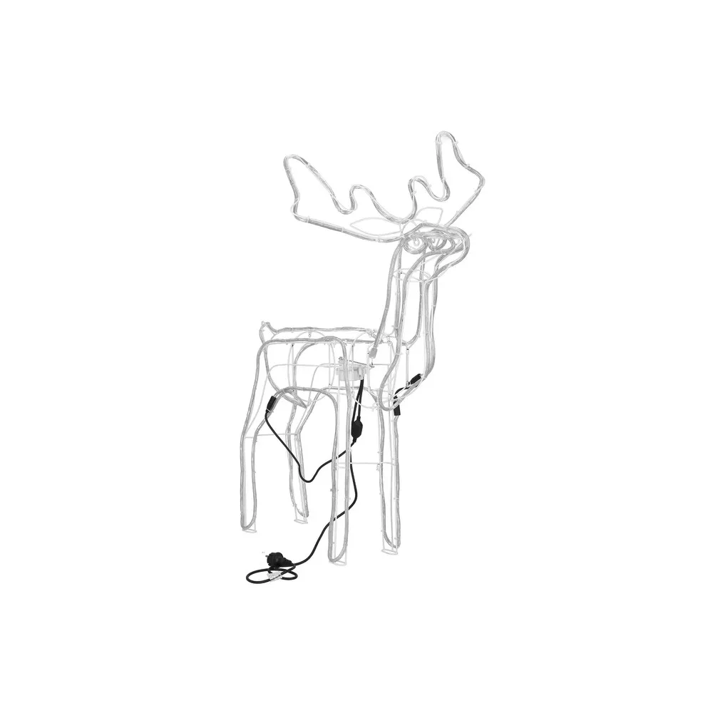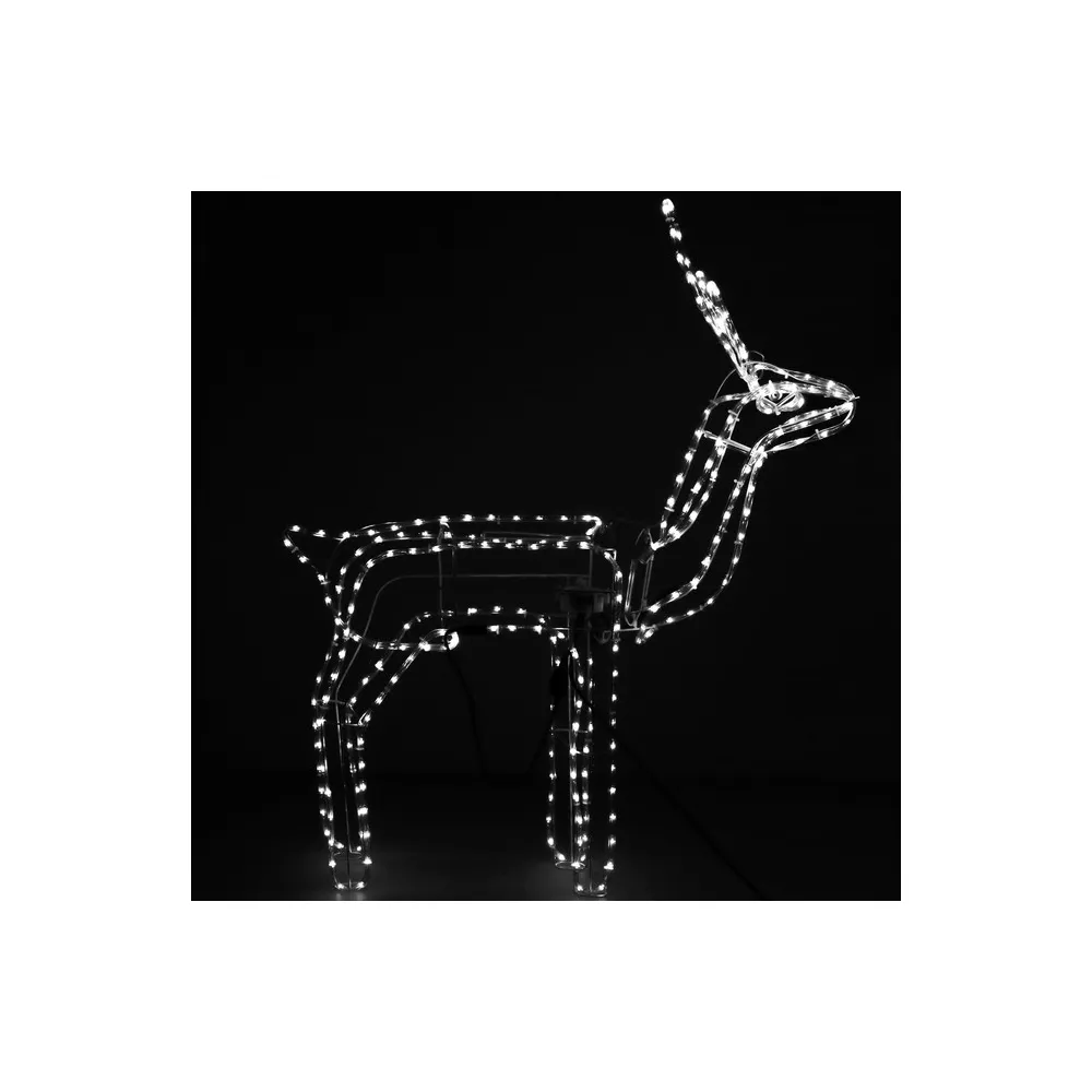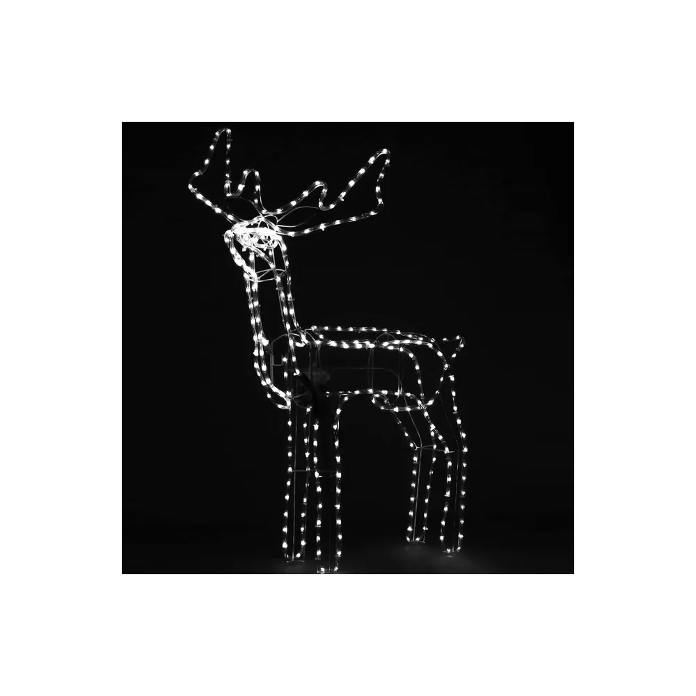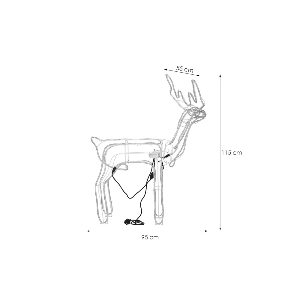 Vysoký sob s pohyblivou hlavou zo strany na stranu - 3D svetelná dekorácia vhodná na vnútorné i vonkajšie použitie, vodeodolné prevedenie s krytím IP44, výška 115 cm, 288 LED, farba ľad studená biela, 2 m napájací kábel. Certifikácia CE, RoHS.