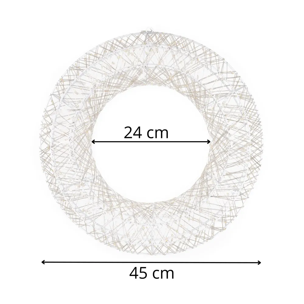 Luxusná svetelná dekorácia v podobe žiariaceho kruhu okamžite navodí sviatočnú atmosféru. Stovky jemných nano diód vytvárajú bohatý svetelný efekt s teplým bielym svetlom, ktoré pôsobia elegantne a útulne. Pevná kovová konštrukcia zaisťuje stabilitu a dlhú životnosť. Vďaka háčiku na zavesenie je inštalácia jednoduchá. Vhodné pre vnútorné aj vonkajšie použitie, bezpečné nízke napätie. Priemer vonkajší 45 cm, priemer vnútornej 24 cm. Certifikácia CE, RoHs, IP44, GS.
