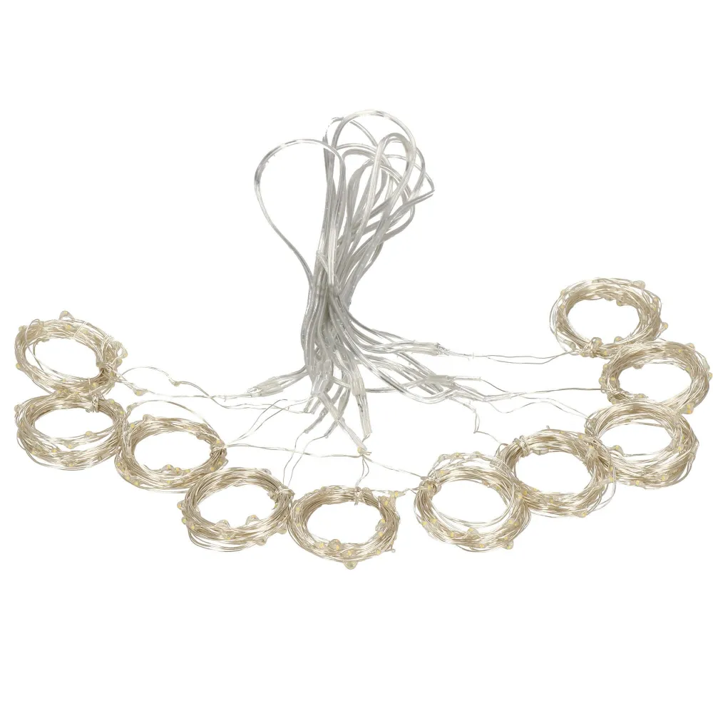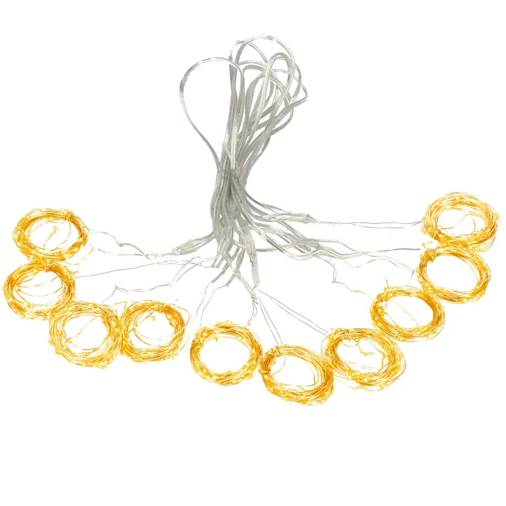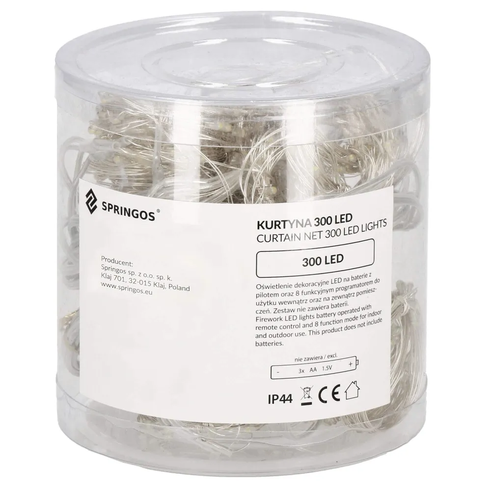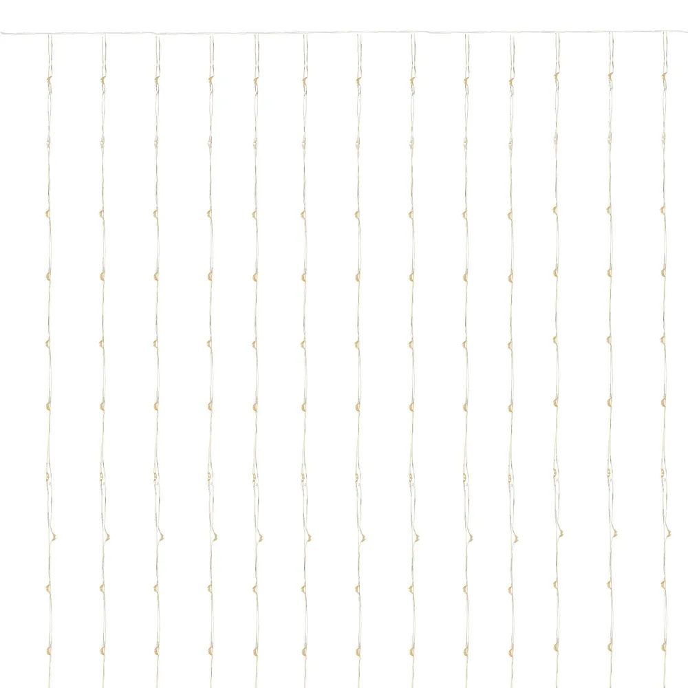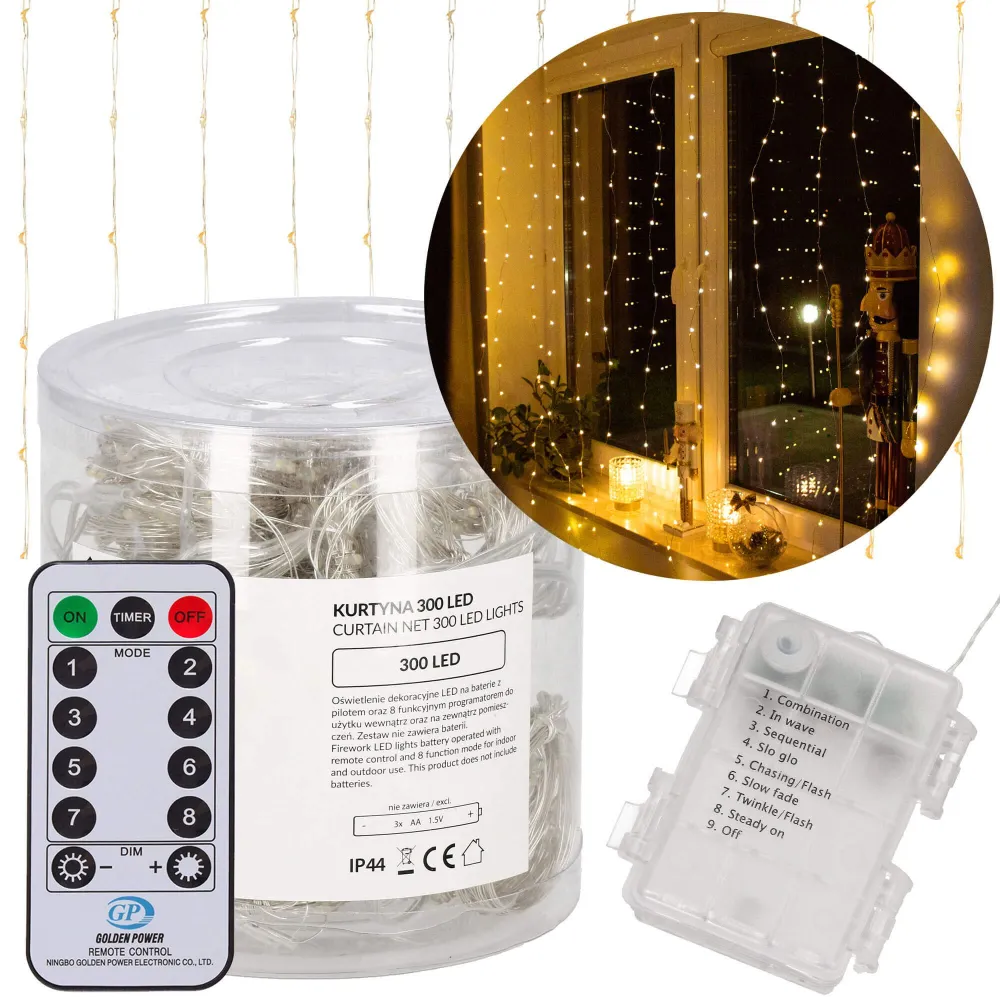 LED svetelná záclona so stovkami žiariacich bodov a 8 svetelnými efektmi. Adaptér na bezpečné napätie, diaľkové ovládanie, ultra úsporné led diódy. Vnútorné aj vonkajšie použitie, vodeodolné prevedenie, krytie IP44. Rozmery svetelnej časti 3x3 m, napájací kábel 3 m. Farba teplá biela, 300 ľad.