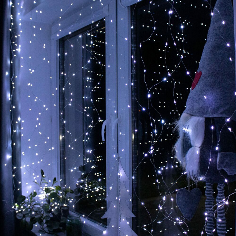 LED svetelná záclona so stovkami žiariacich bodov a 8 svetelnými efektmi. Adaptér na bezpečné napätie, diaľkové ovládanie, ultra úsporné ľad diódy. Vnútorné aj vonkajšie použitie, vodeodolné prevedenie, krytie IP44. Rozmery svetelnej časti 3x3 m, napájací kábel 3 m. Farba studená biela, 300 ľad.