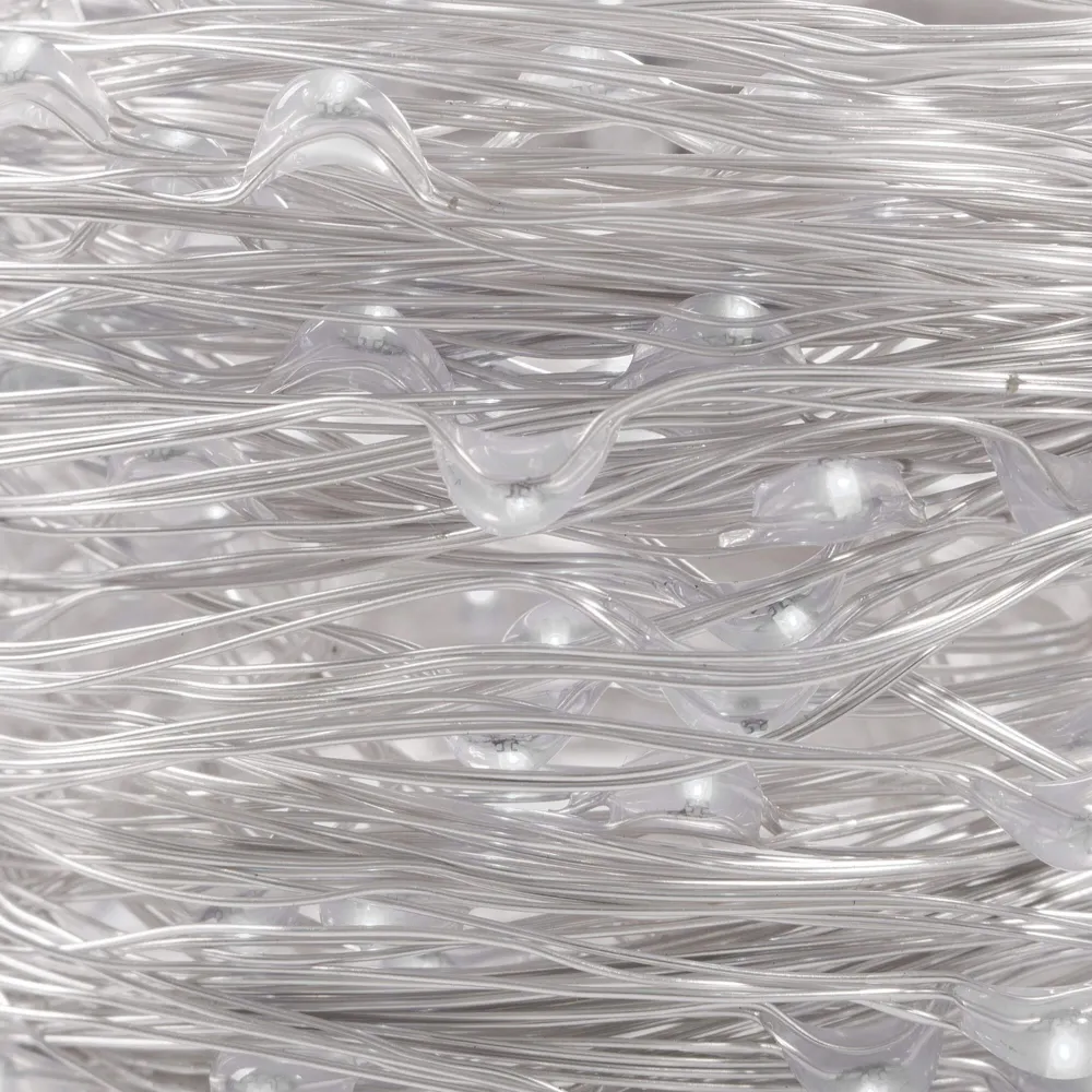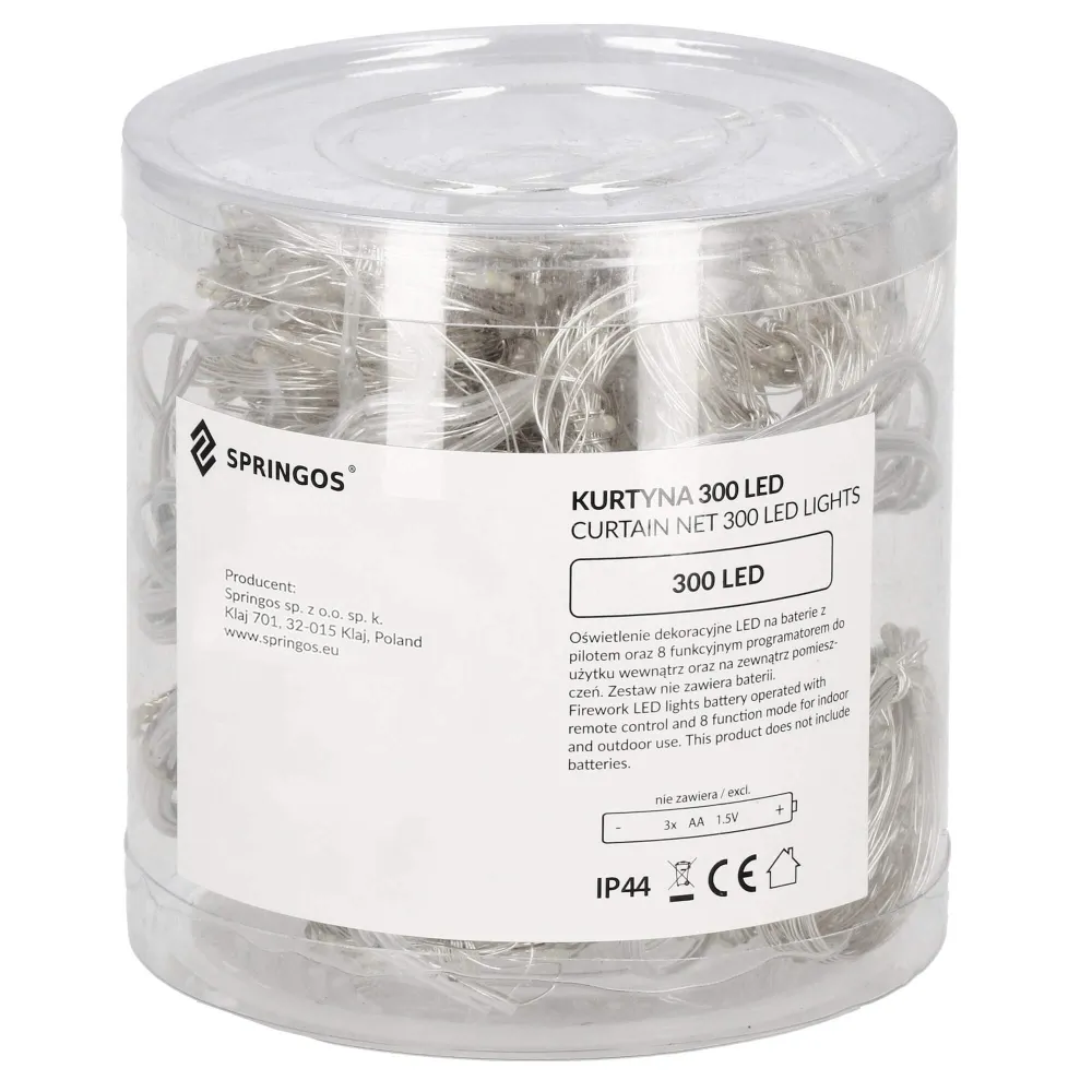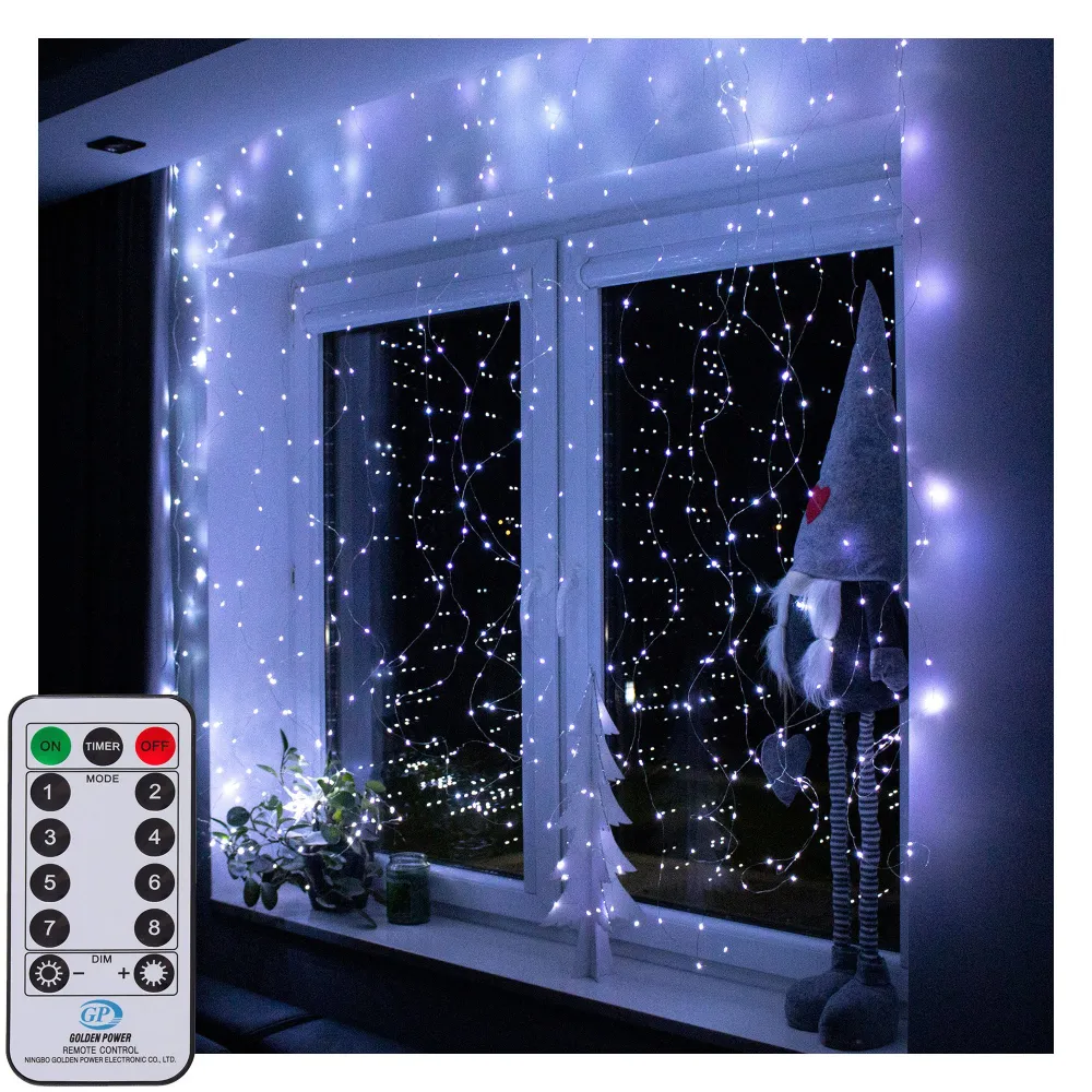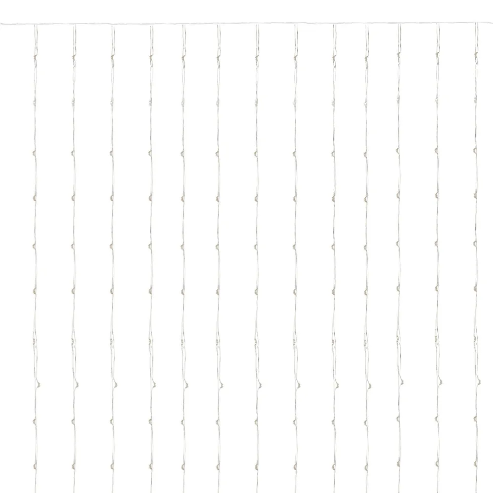 LED svetelná záclona so stovkami žiariacich bodov a 8 svetelnými efektmi. Adaptér na bezpečné napätie, diaľkové ovládanie, ultra úsporné ľad diódy. Vnútorné aj vonkajšie použitie, vodeodolné prevedenie, krytie IP44. Rozmery svetelnej časti 3x3 m, napájací kábel 3 m. Farba studená biela, 300 ľad.