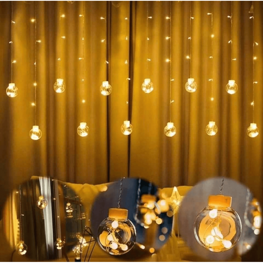 LED svetelná záclona s ozdobnými bankami a 8 svetelnými funkciami vrátane efektu záblesku. Ultra úsporné ľad diódy, vnútorné použitie, krytie IP20. Rozmery svetelnej časti 2,5x1 m, napájací kábel 2 m. Farba teplá biela, 108 ľad.