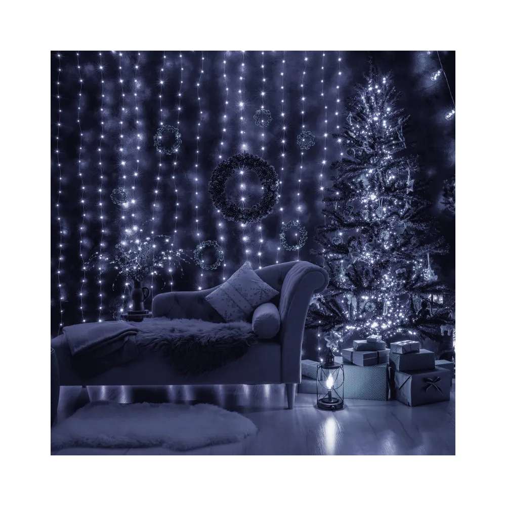 LED svetelná záclona so stovkami žiariacich bodov a 8 svetelnými efektmi. Adaptér na bezpečné napätie, diaľkové ovládanie, ultra úsporné led diódy. Vnútorné aj vonkajšie použitie, vodeodolné prevedenie, krytie IP44. Rozmery svetelnej časti 3x3 m, napájací kábel 3 m. Farba studená biela, 306 ľad.