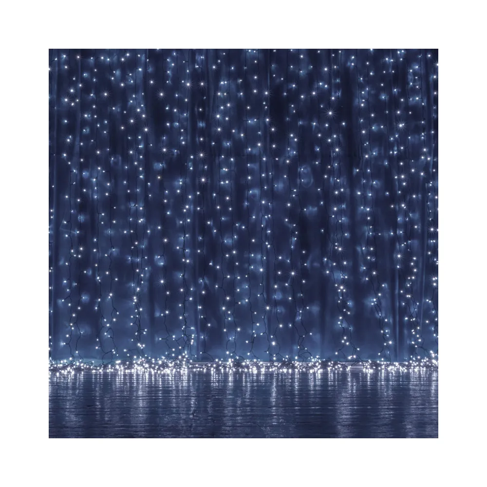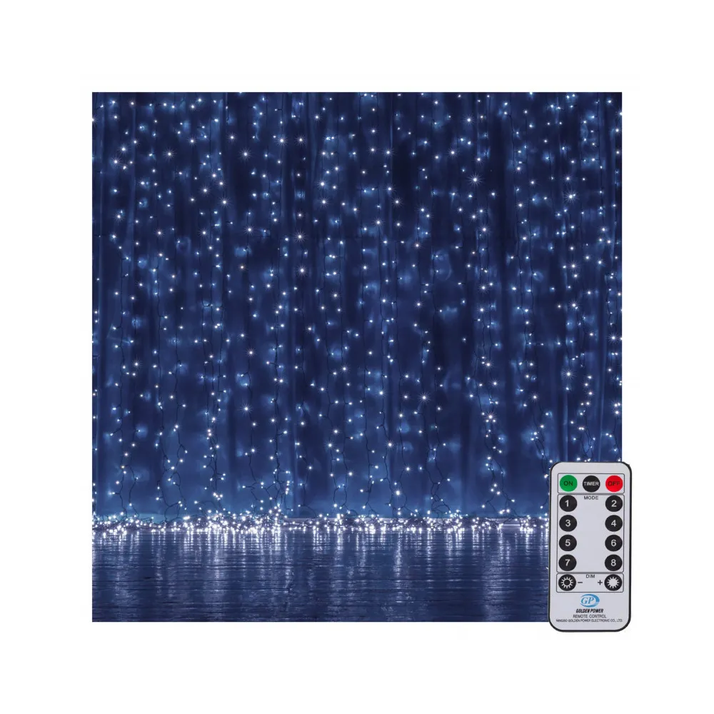 LED svetelná záclona so stovkami žiariacich bodov a 8 svetelnými efektmi. Adaptér na bezpečné napätie, diaľkové ovládanie, ultra úsporné ľad diódy. Vnútorné aj vonkajšie použitie, vodeodolné prevedenie, krytie IP44. Rozmery svetelnej časti 3x3 m, napájací kábel 3 m. Farba studená biela, 306 ľad.