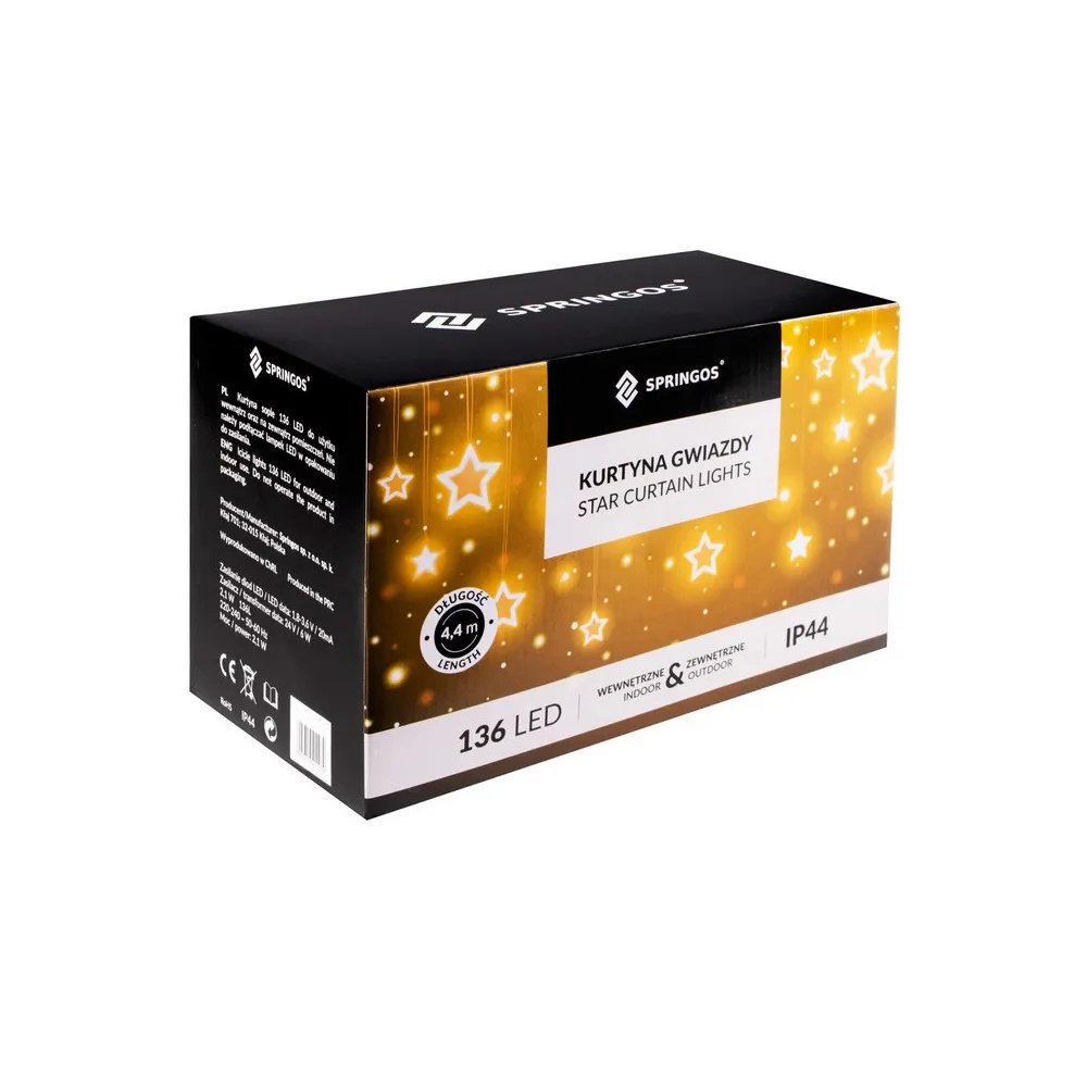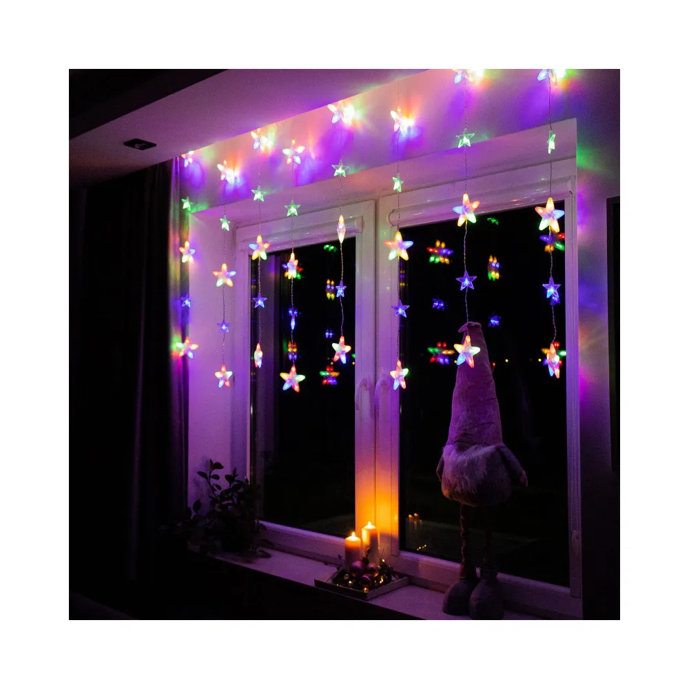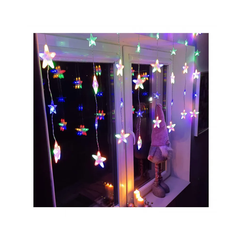 LED svetelná záclona s prekrásnymi hviezdami a 8 svetelnými efektmi . Adaptér na bezpečné napätie, diaľkové ovládanie, ultra úsporné led diódy, transparentný kábel. Vnútorné aj vonkajšie použitie, vodeodolné prevedenie, krytie IP44. Rozmery svetelnej časti 2x1,1 m, napájací kábel 2,4 m. Farba multicolor, 136 ľad.