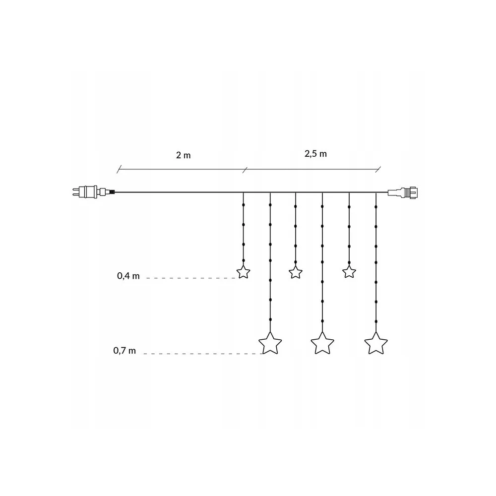 LED svetelná záclona s prekrásnymi hviezdami a 8 svetelnými efektmi. Adaptér na bezpečné napätie, ultra úsporné led diódy, transparentný kábel. Vnútorné aj vonkajšie použitie, vodeodolné prevedenie, krytie IP44. Rozmery svetelnej časti 2x0,7 m, napájací kábel 2,5 m. Farba multicolor, 92 ľad.