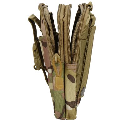 Praktická pánska taška na opasok v maskáčovom vzore z vodeodolného materiálu. Ponúka veľké množstvo vreciek, puzdro na telefón a štyri hlavné oddiely uzatvárateľné zipsom. Ideálne na prehľadné uloženie všetkých potrebných vecí pri cestovaní, športe či každodennom nosení. Rozmery 17,5x12x5 cm.
