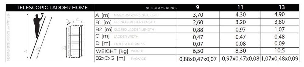 Univerzálny teleskopický rebrík, 1x9 priečok, max. pracovná výška 3,70 m, nosnosť 125 kg. Kompaktný, ľahký, ľahko prenosný a úplne univerzálny rebrík na prácu vo výškach. Vhodný na každodenné domáce použitie, okolo domu alebo na záhrade.