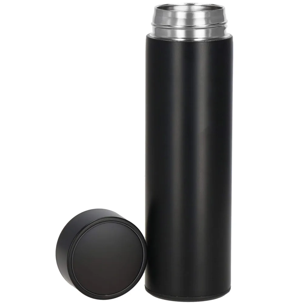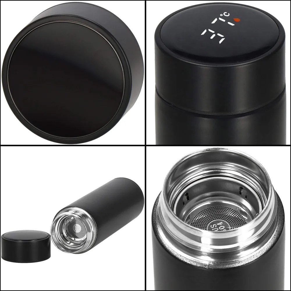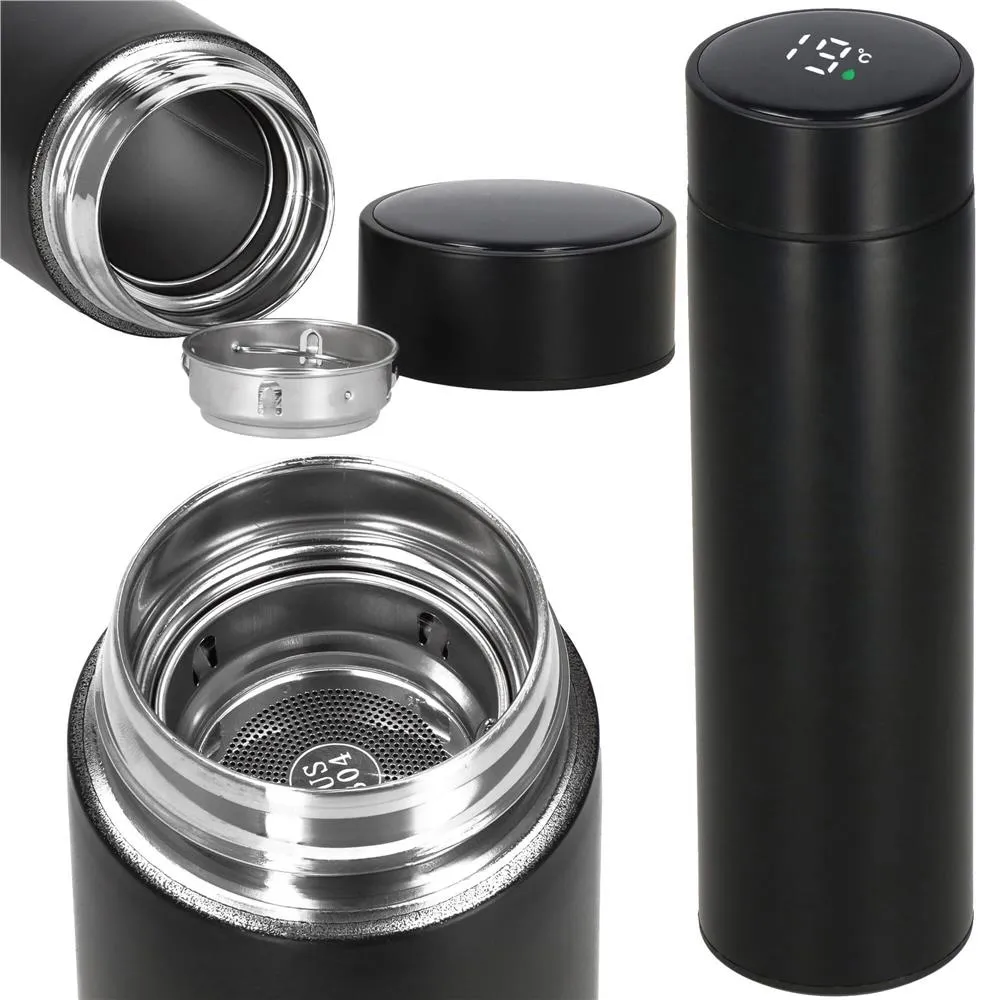 Elegantná nerezová termoska so šikovným LED displejom zobrazuje aktuálnu teplotu nápoja. Vďaka skvelej tepelnej izolácii udrží váš nápoj teplý alebo studený až 24 hodín. Termohrnček obsahuje praktické sitko pre sypané čaje aj mletú kávu. Skrutkovací uzáver a silikónové tesnenie zaisťujú, že termofľaša netečie. Farebný indikátor informuje o teplote nápoja. Štýlový a odolný dizajn na každodenné použitie. Kapacita 500 ml.