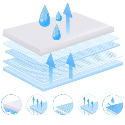 Podložky sú vyrobené pomocou špeciálnej technológie , ktorá zahŕňa niekoľko vrstiev materiálu . Vrchnú vrstvu tvorí netkaná textília a pod ňou nájdeme rolovacie papiere a absorbčné granule , ktoré menia kvapalinu na gél. Najnižšiu vrstvu potom tvorí fólia chrániaca proti úniku kvapalín. To všetko zaručí tak skvelé vlastnosti podložky, v sade nájdete 10ks .