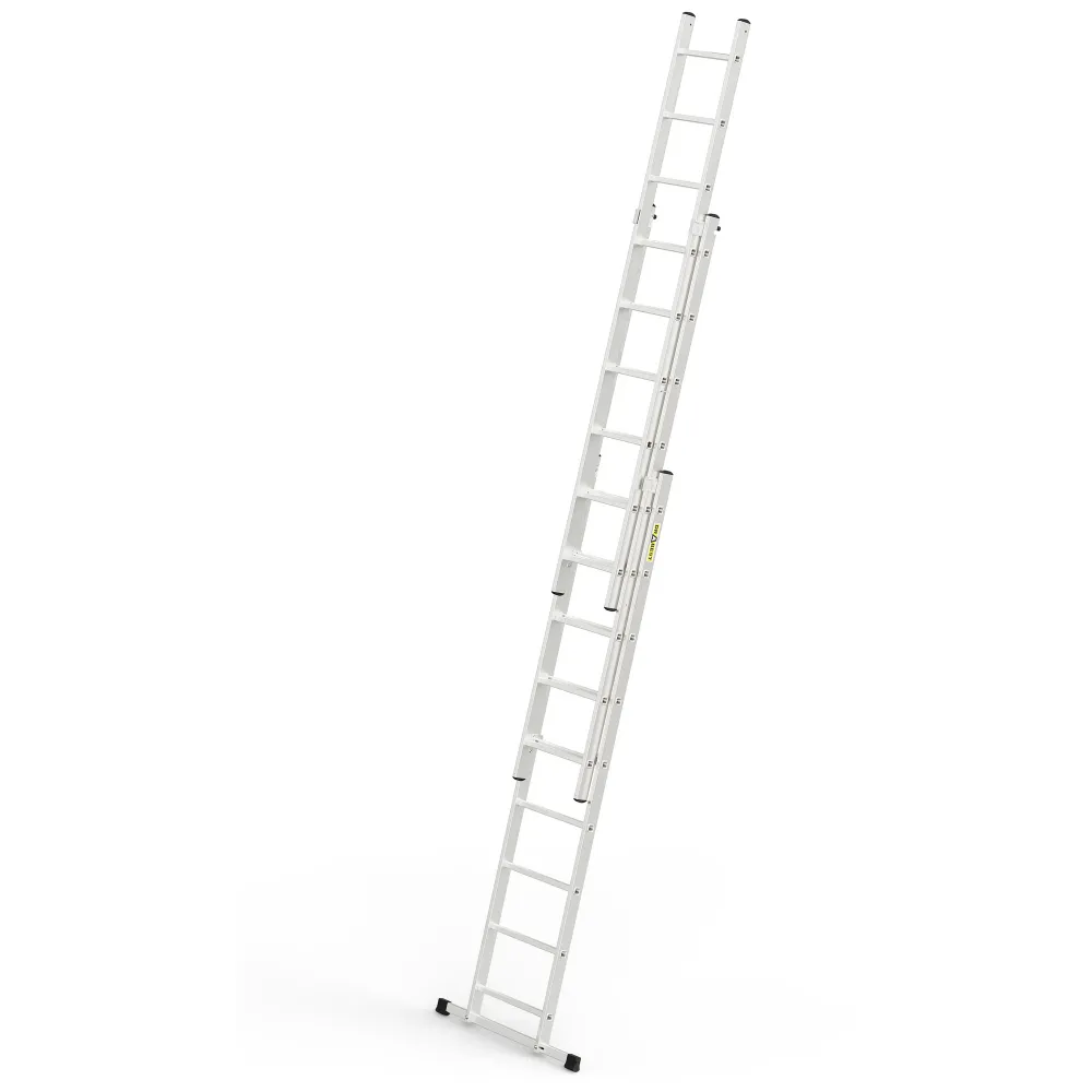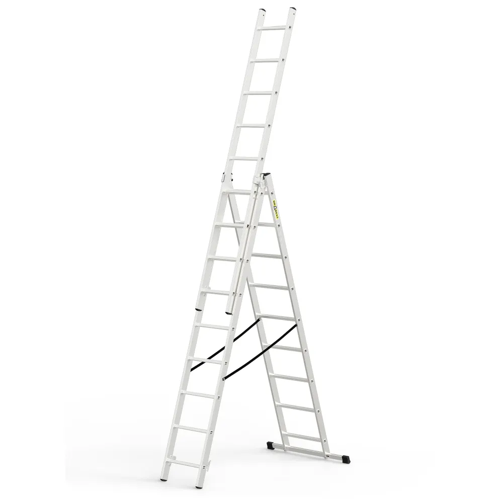 Viacúčelový hliníkový rebrík so stabilizátorom , 3x9 priečok, max. pracovná výška 5,47 m, nosnosť 150 kg. Certifikácia TÜV Rheinland, EN 131 pre domáce použitie.