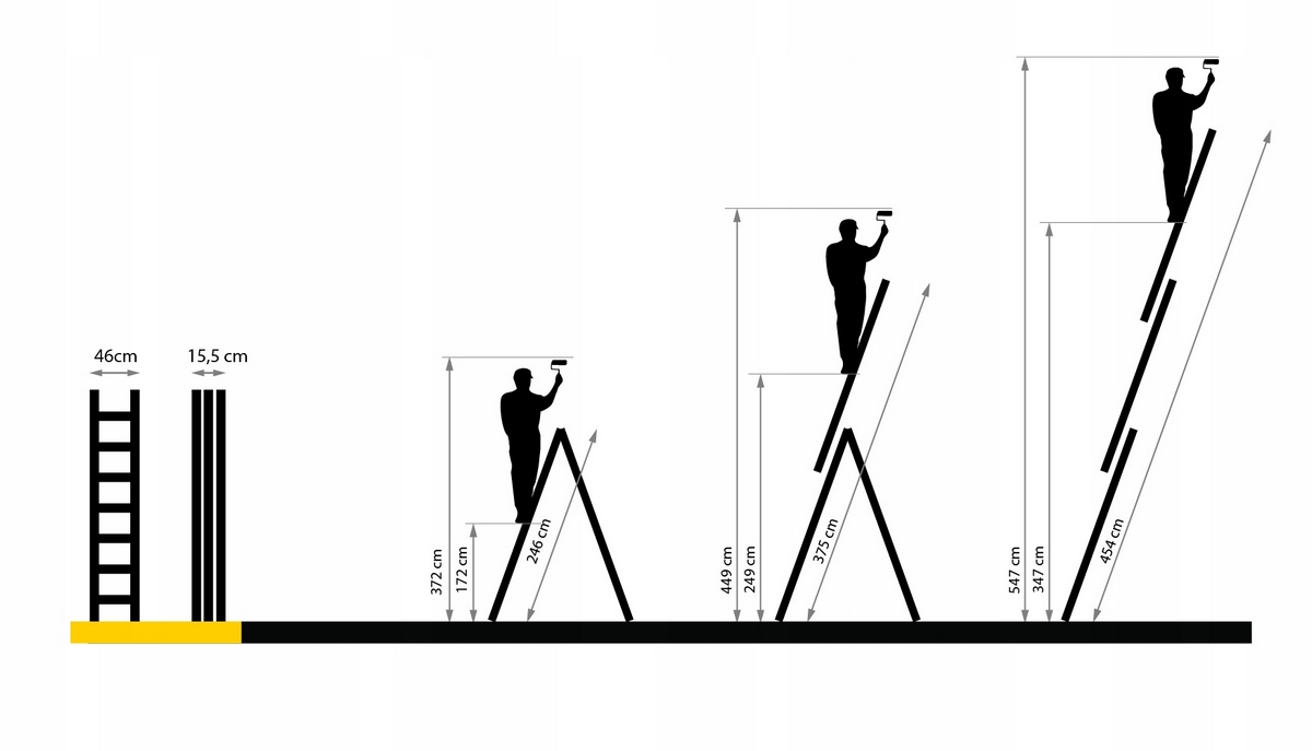 Viacúčelový hliníkový rebrík so stabilizátorom, 3x9 priečok, max. pracovná výška 5,47 m, nosnosť 150 kg. Certifikácia TÜV Rheinland, EN 131 pre domáce použitie.