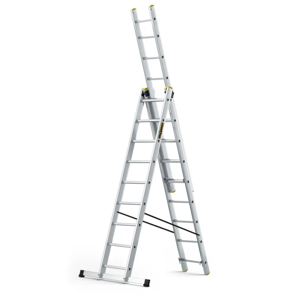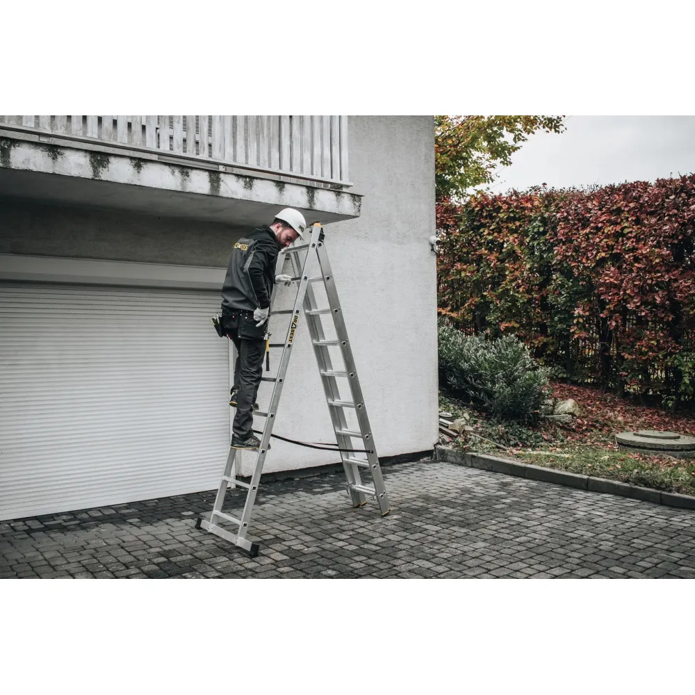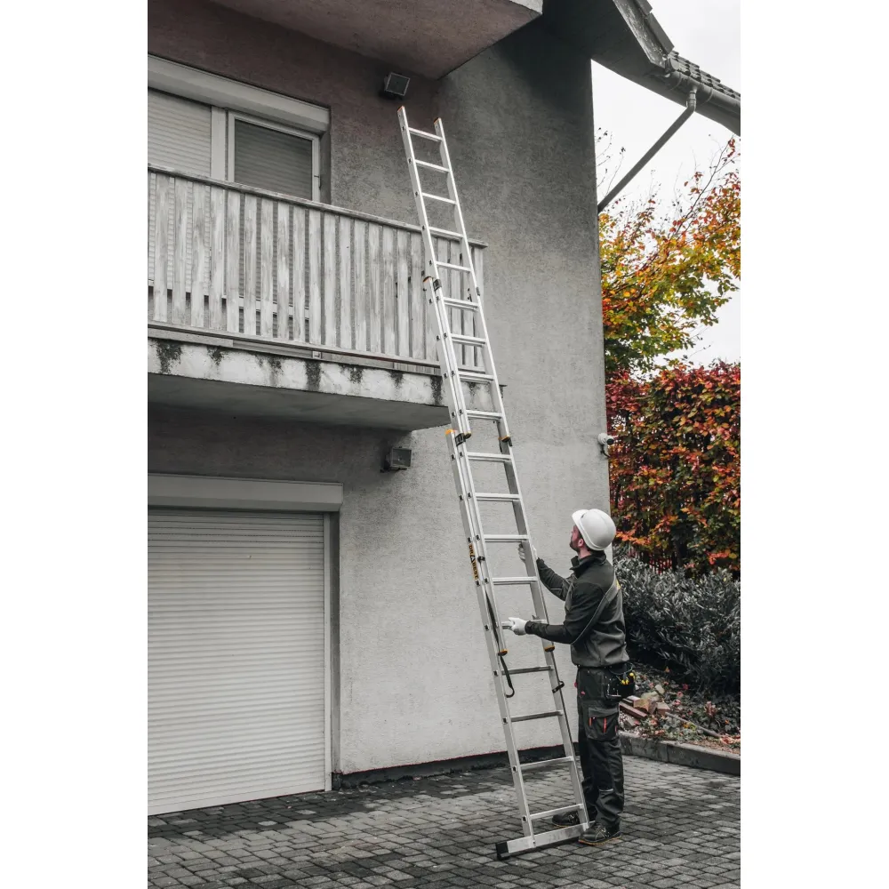 Profesionálny viacúčelový rebrík so stabilizátorom , 3x9 priečok, max. pracovná výška 5,84 m, nosnosť 150 kg. Certifikácia TÜV Rheinland, EN 131 pre profi použitie.