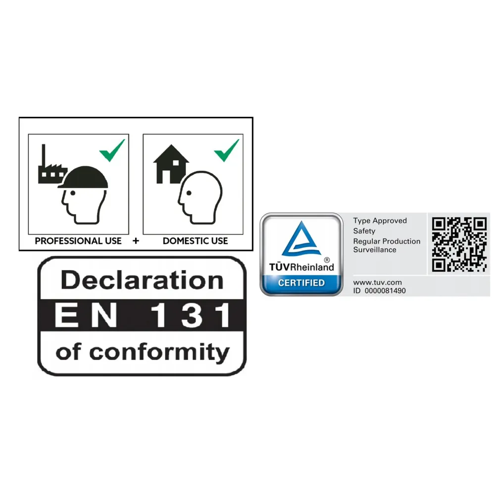 - Certifikácia TÜV Rheinland, EN 131 na profesionálne použitie
