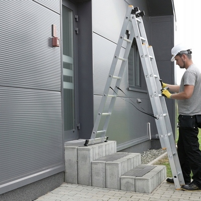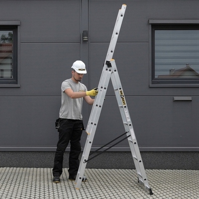 Profesionálny viacúčelový rebrík so stabilizátorom, 3x15 priečok, max. pracovná výška 10,40 m, nosnosť 150 kg. Certifikácia TÜV Rheinland, EN 131 pre profi použitie.