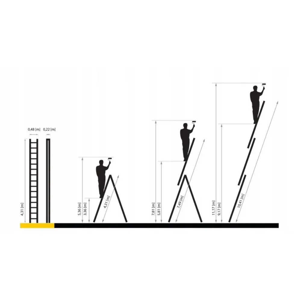 Profesionálny viacúčelový rebrík so stabilizátorom , 3x16 priečok, max. pracovná výška 10,83 m, nosnosť 150 kg. Certifikácia TÜV Rheinland, EN 131 pre profi použitie.