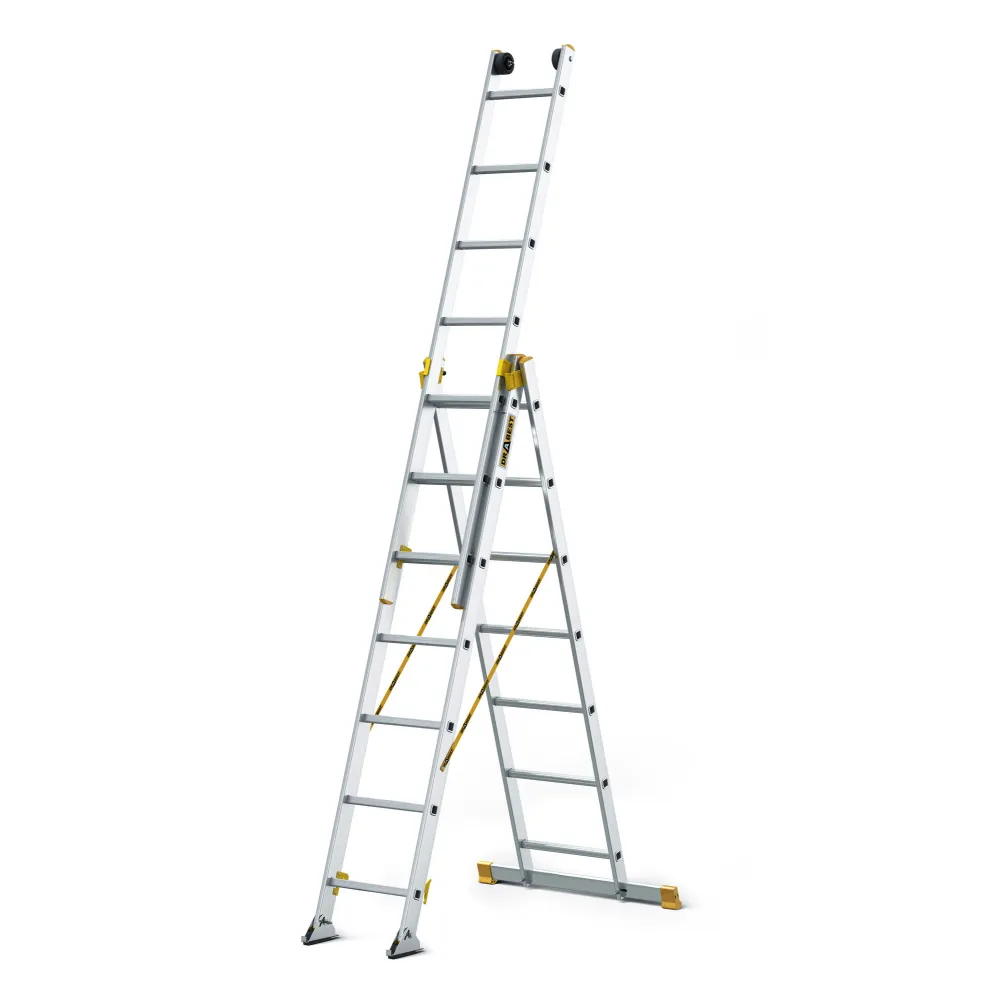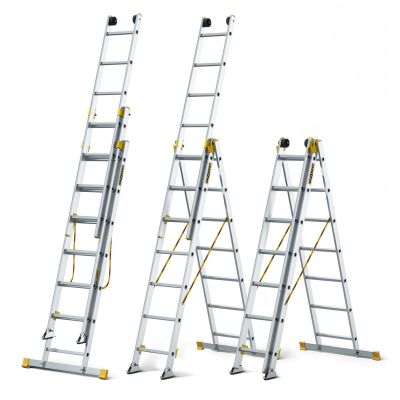 Profesionálny viacúčelový rebrík so stabilizátorom a bohatým príslušenstvom, 3x7 priečok, max. pracovná výška 5,30 m, nosnosť 150 kg. Certifikácia EN 131 pre profi použitie.
