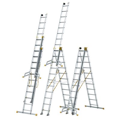 Profesionálny viacúčelový rebrík s dvoma stabilizátormi a bohatým príslušenstvom, 3x11 priečok, max. pracovná výška 8,34 m, nosnosť 150 kg. Certifikácia EN 131 pre profi použitie.