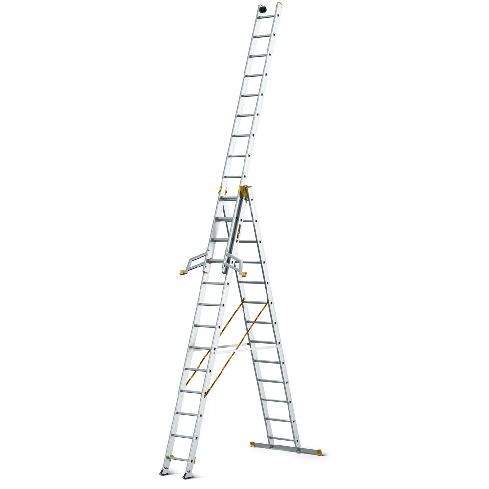 Profesionálny viacúčelový rebrík s dvoma stabilizátormi a bohatým príslušenstvom, 3x13 priečok, max. pracovná výška 10,07 m, nosnosť 150 kg. Certifikácia EN 131 pre profi použitie.
