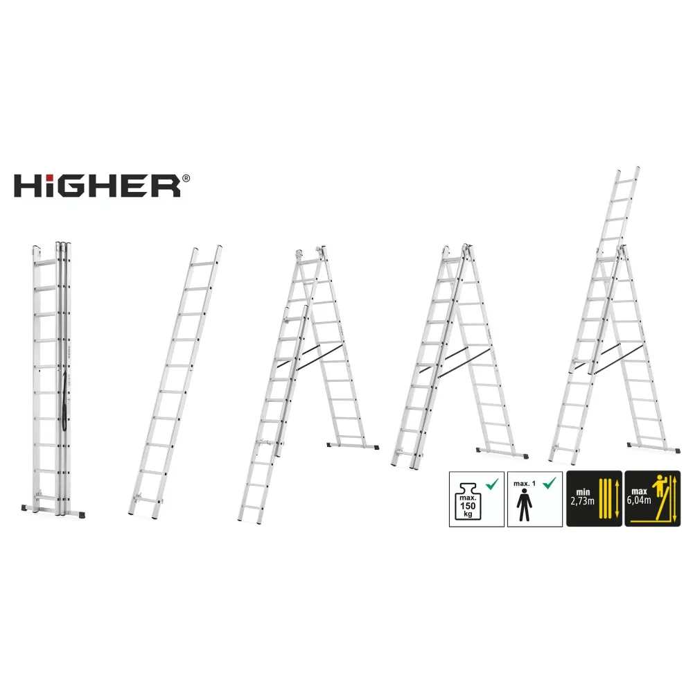 Hliníkový rebrík 3x10 priečok 6,04 m trojdielny HIGHER 6310 je praktickým pomocníkom pre každého, kto hľadá spoľahlivý a bezpečný viacúčelový rebrík. Vďaka svojej konštrukcii ponúka 5 možností zostavenia vrátane funkcie na schody , čo oceníte pri práci v nerovnom teréne alebo na schodisku. Je vhodný na použitie v interiéri aj exteriéri.