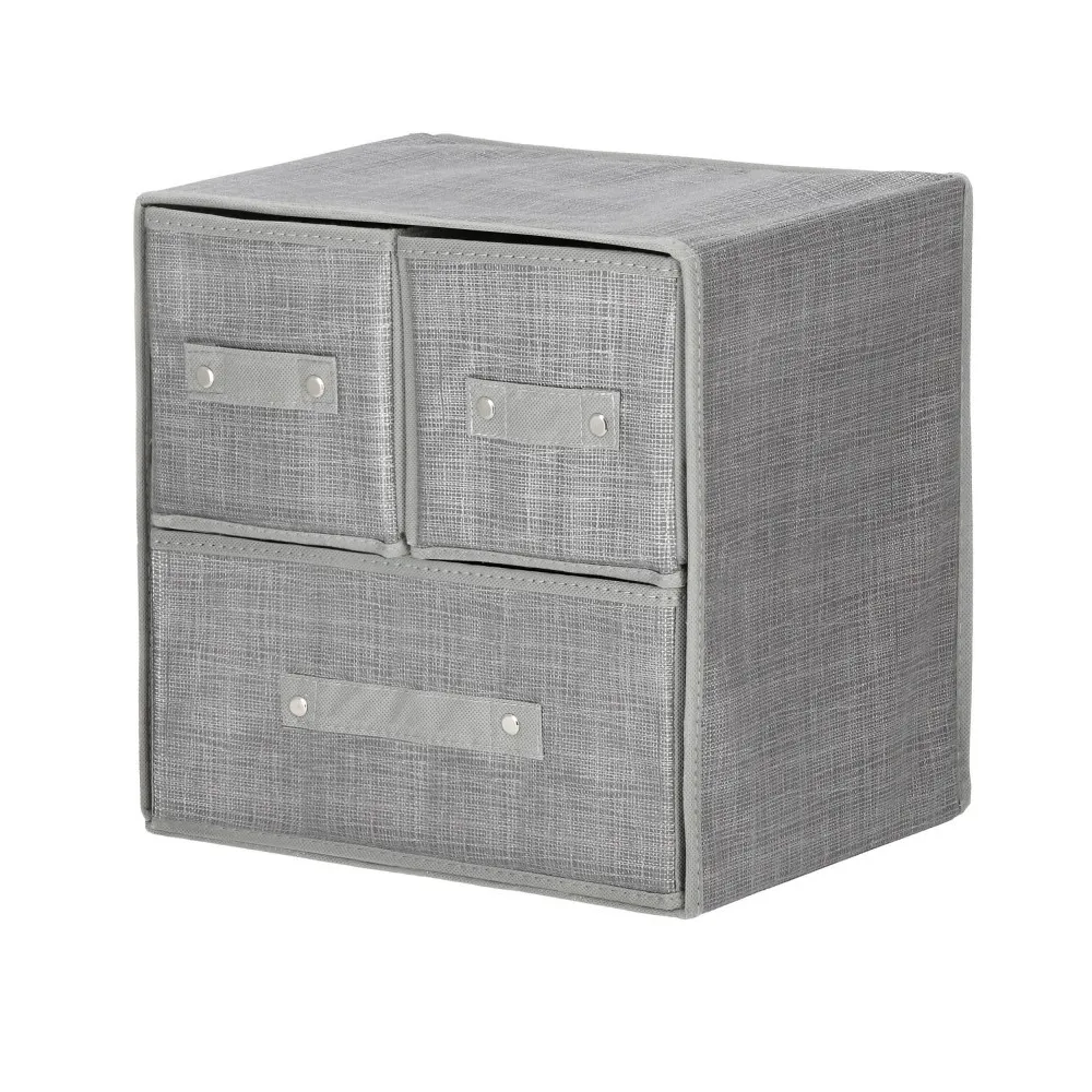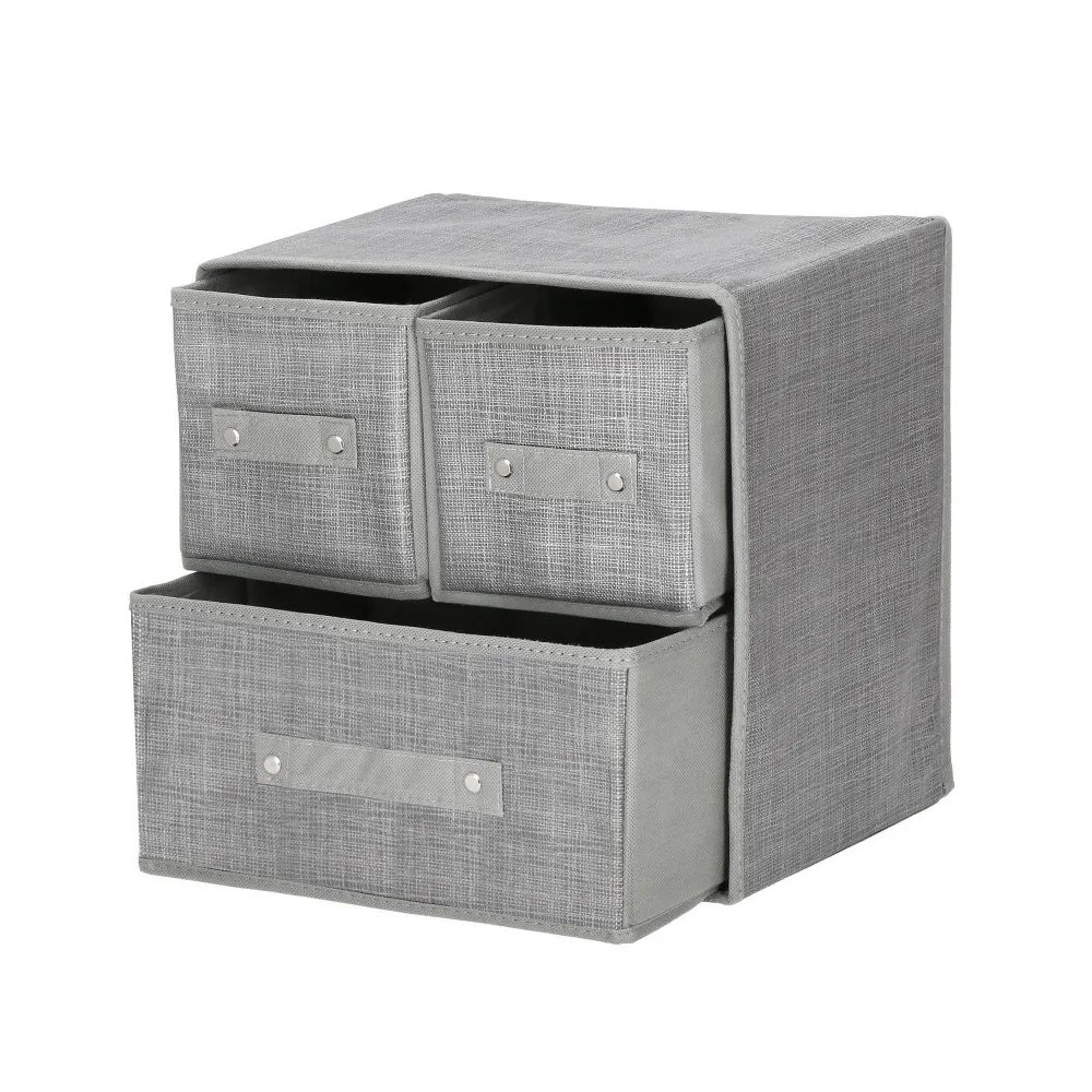 Sada 4 zásuvkových organizérov z kvalitnej šedej netkanej textílie vám umožní usporiadať bielizeň, kozmetiku, hračky alebo urobiť poriadok v menších veciach. Výhodou organizéra je jeho ľahkosť, takže ho možno premiestniť na iné miesta, navyše má štýlový vzhľad, napriek tomu stabilnú konštrukciu. Rozmery 30x30x29 cm .