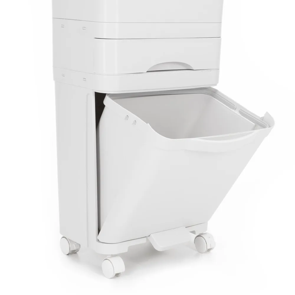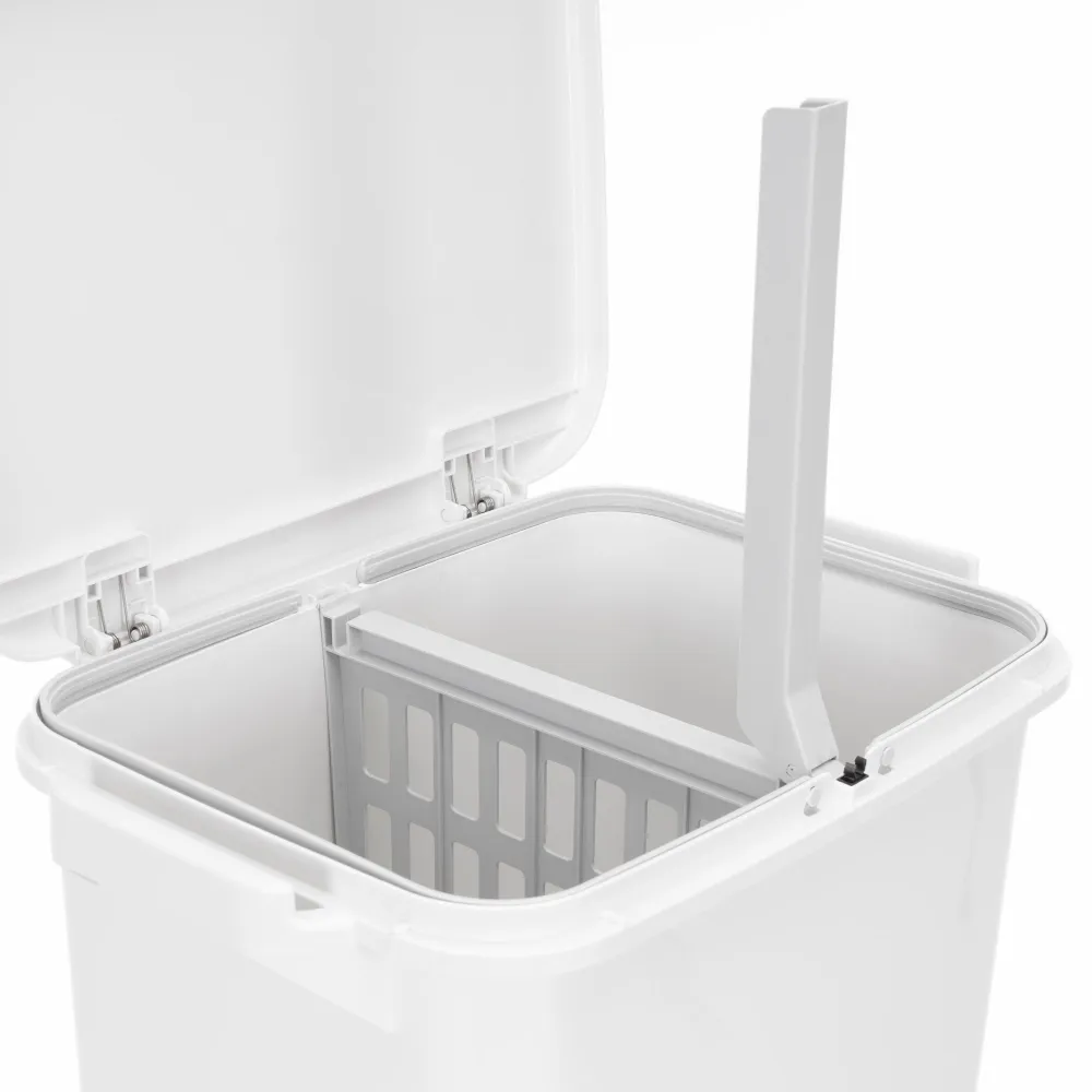 Praktické členenie zahŕňa hornú priehradku s vekom , výsuvnú prostrednú zásuvku a spodnú časť ovládanú nožným pedálom , čo zaisťuje hygienické a pohodlné používanie bez nutnosti dotyku rúk . Horný priestor je možné navyše rozdeliť na dve sekcie , takže triedenie je ešte efektívnejšie. Veľká celková kapacita je ideálna aj pre väčšie domácnosti.