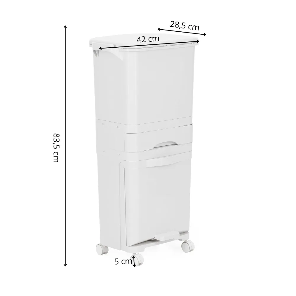 Praktické riešenie pre ľahké triedenie odpadu v domácnosti. Viacúrovňové prevedenie umožňuje prehľadné rozdelenie rôznych druhov odpadu bez zbytočného neporiadku. Vďaka kolieskam s aretáciou sa s košom ľahko manipuluje a nožný pedál zaisťuje hygienické otváranie. Vysúvacia zásuvka aj horné veko uľahčujú každodenné používanie a moderný dizajn zapadne do kuchyne aj technickej miestnosti.