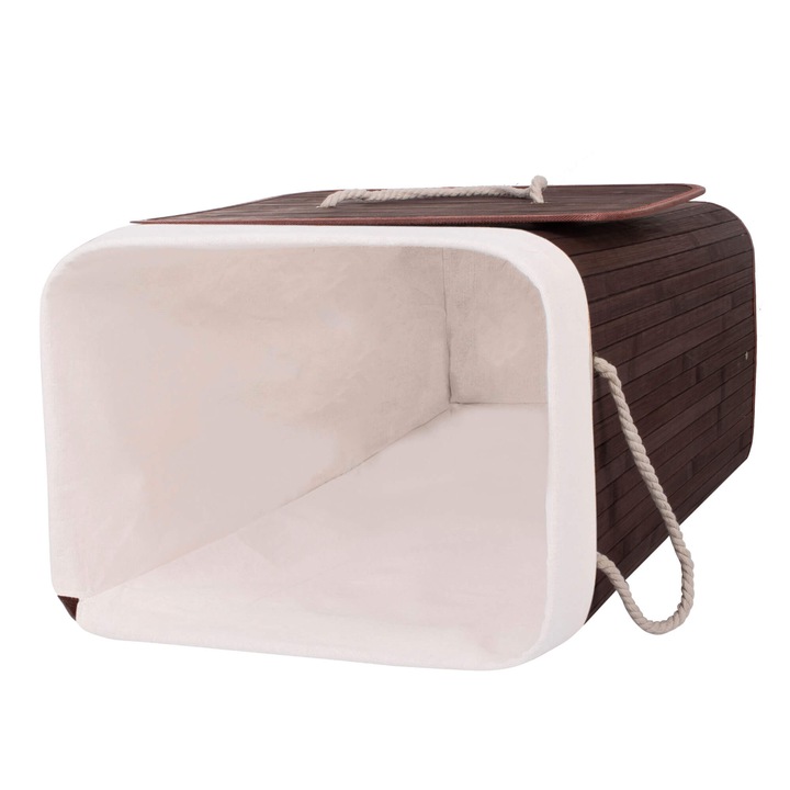 Uzatvárateľný klopa umožňuje schovať obsah, teda oblečenie určené na pranie. Veko aj bočné steny koša sú opatrené šnúrkami , ktoré uľahčujú prenášanie prvku a využívanie jeho vnútra. Košík je vyrobený z kvalitného prírodného bambusu , ktorý je ekologický a predovšetkým ľahký. Jeho objem je až 72l , takže sa doňho zmestí veľké množstvo vecí.