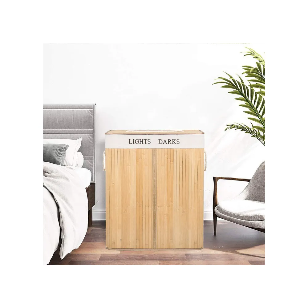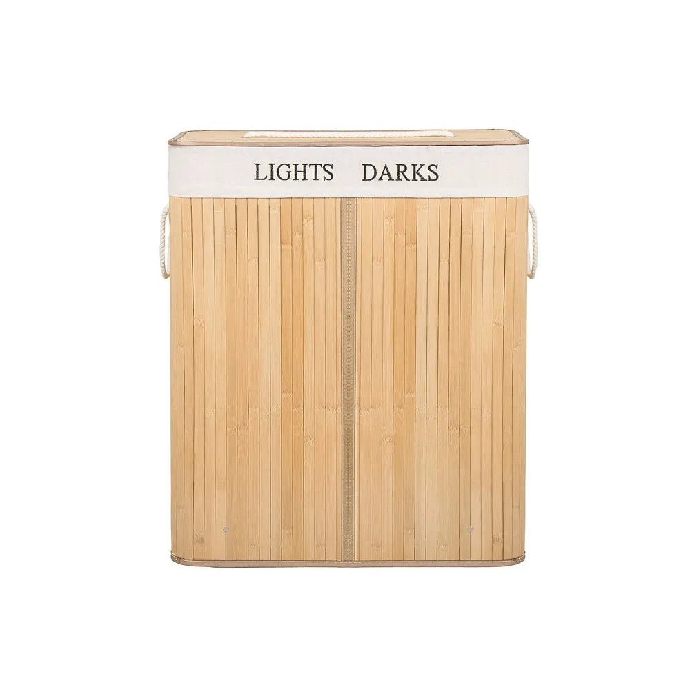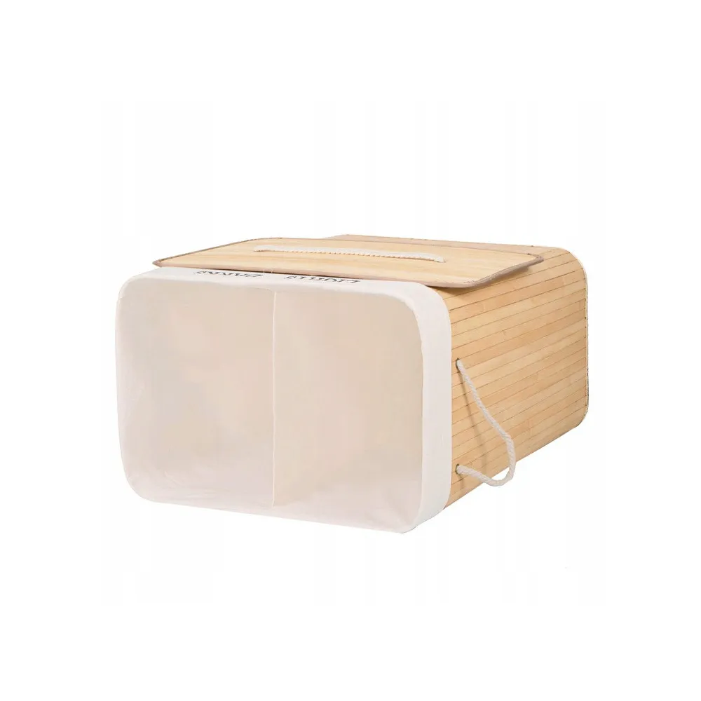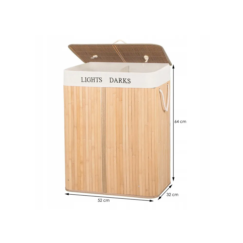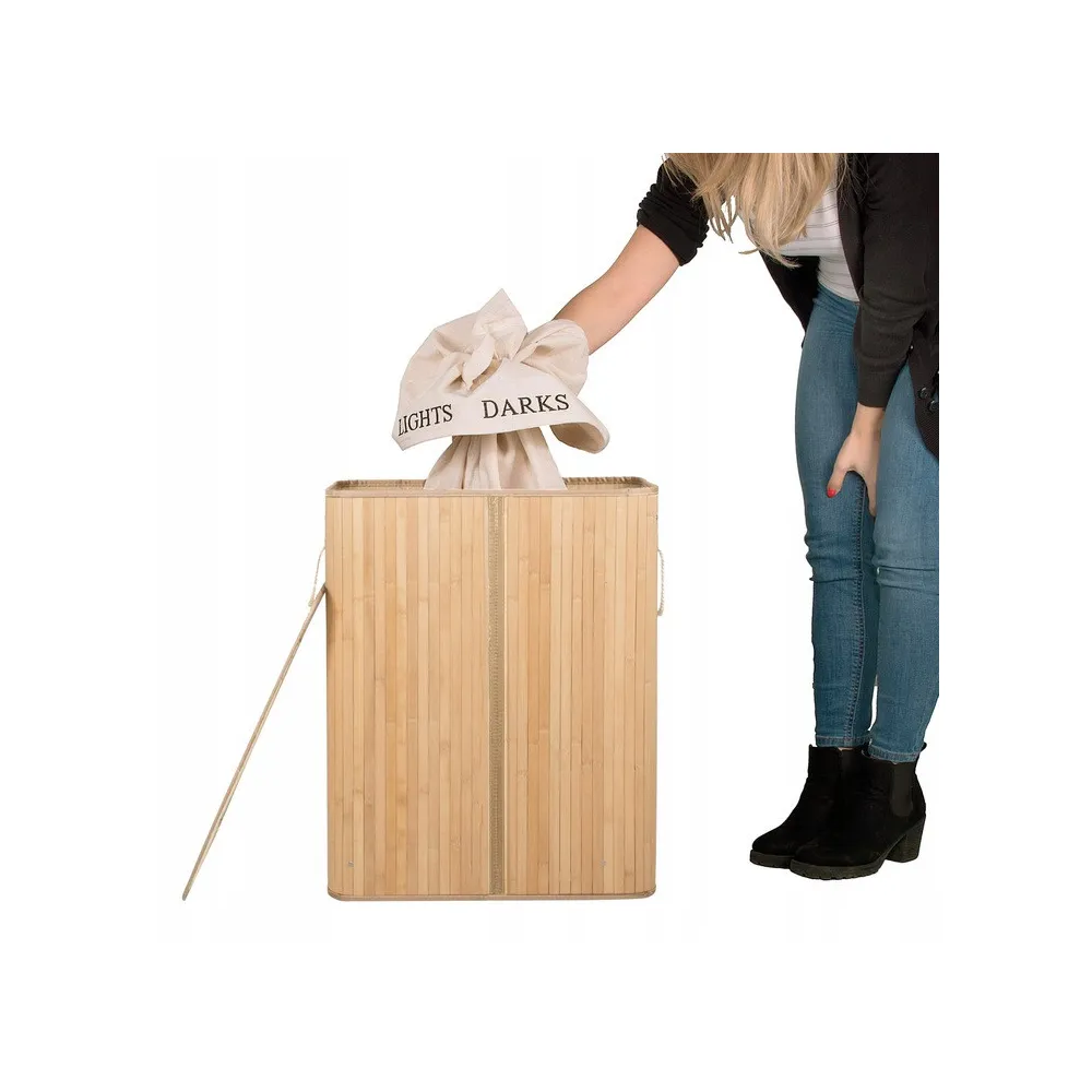 Bambusový kôš na bielizeň Springos s objemom 100l s dvoma oddielmi je praktickým a funkčným doplnkom každého interiéru. Kôš na zber špinavej bielizne a spodnej bielizne je vyrobený z prírodného bambusu vo svetlo hnedej farbe. Ľahká konštrukcia a štýlový dizajn, vyberateľná vnútorná taška neabsorbuje vlhkosť a pachy, veľký objem, praktické madlo.