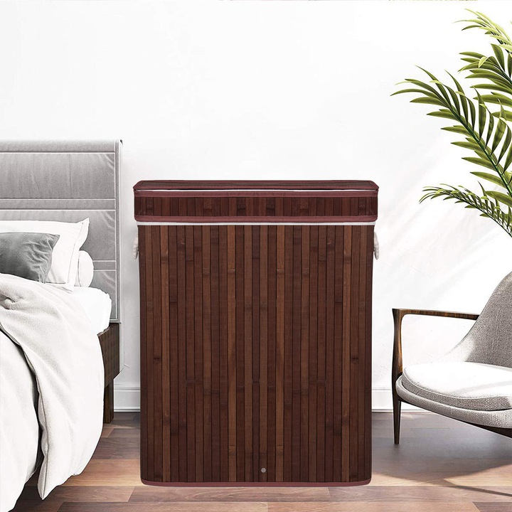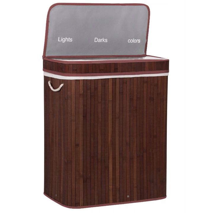 Bambusový kôš na bielizeň Springos s objemom 100l s tromi oddielmi je praktickým a funkčným doplnkom každého interiéru . Kôš na zber špinavej bielizne a spodnej bielizne je vyrobený z prírodného bambusu v tmavo hnedej farbe. Ľahká konštrukcia a štýlový dizajn, vyberateľná vnútorná taška neabsorbuje vlhkosť a pachy, rukoväte v podobe lana.