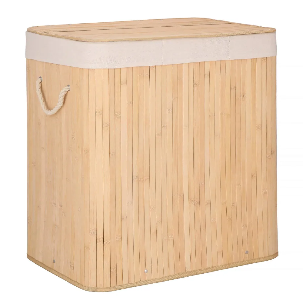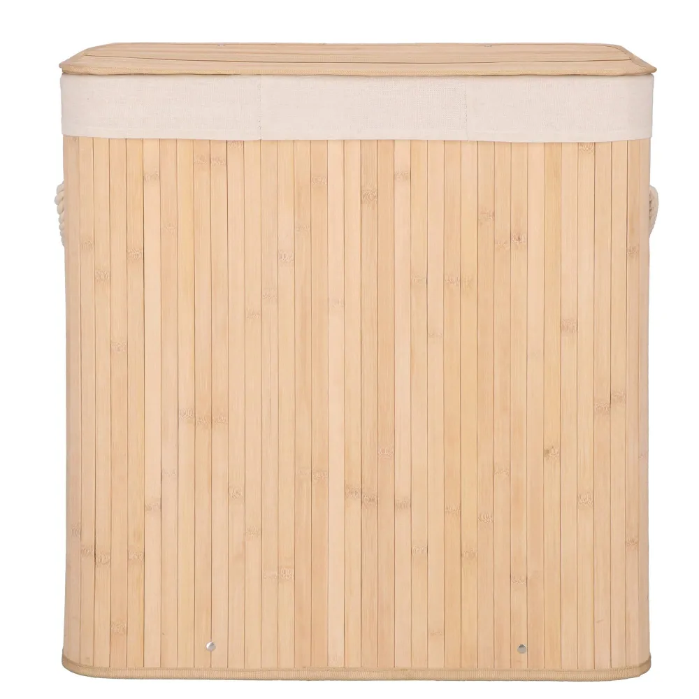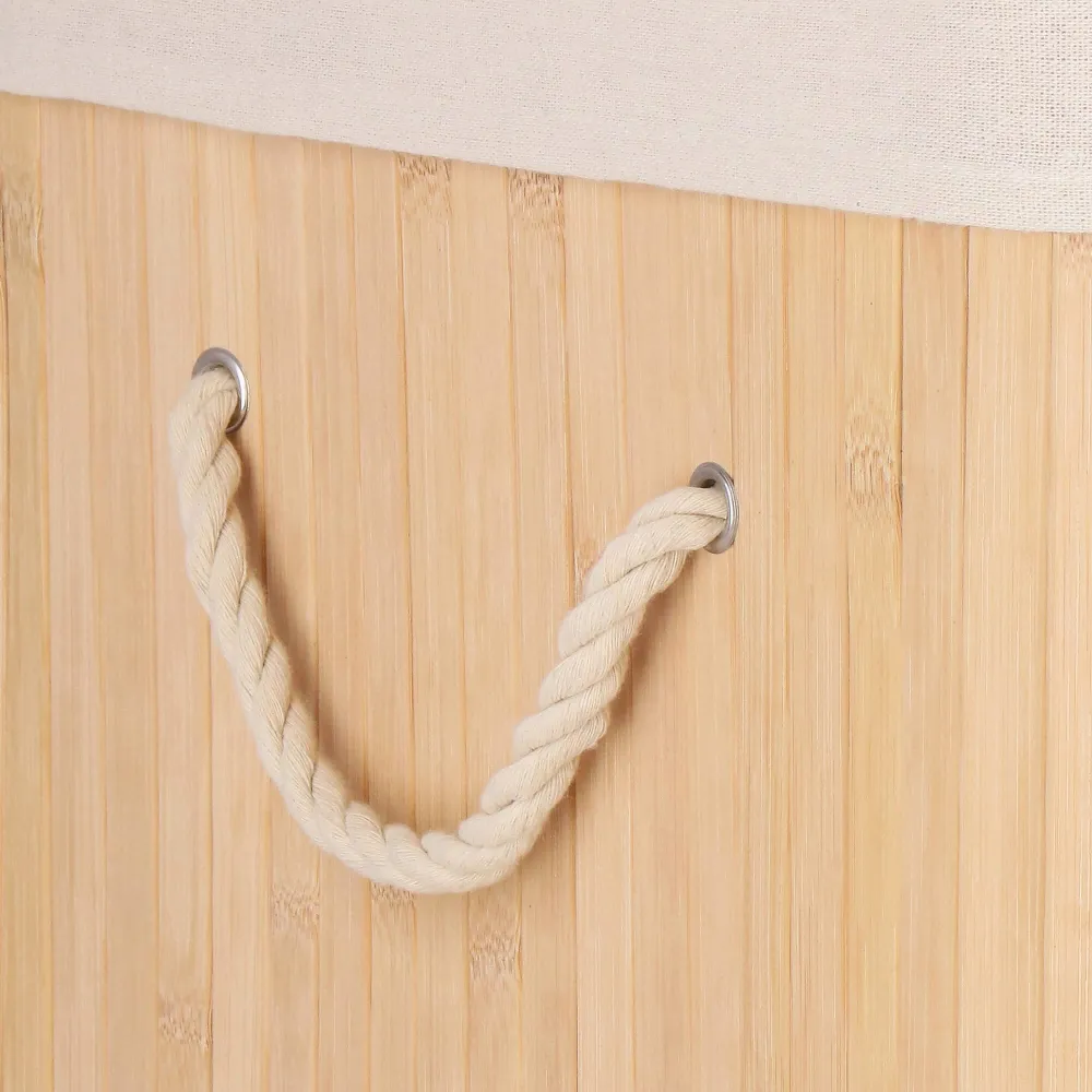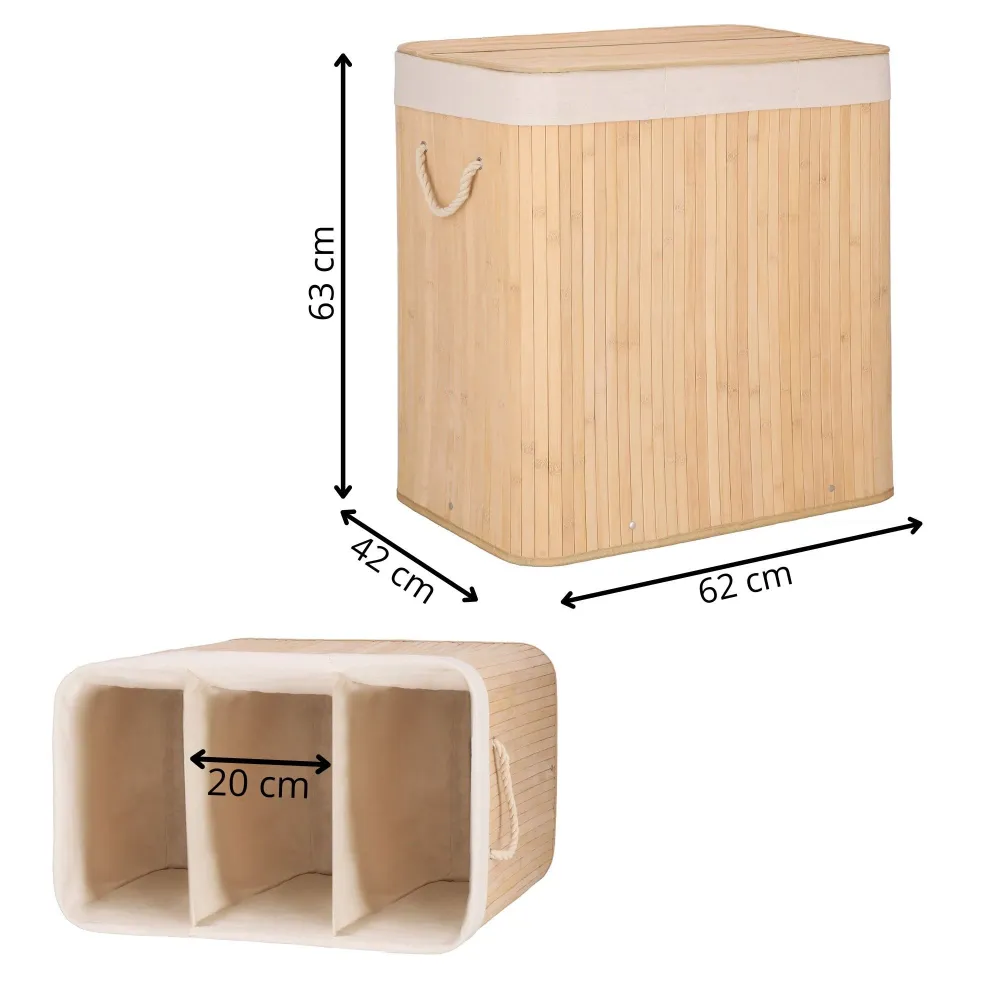 Kôš na triedenie špinavej bielizne s objemom 150 litrov ponúka praktické riešenie pre domácnosť. Kôš s troma oddielmi uľahčuje triedenie svetlej, tmavej a farebnej bielizne. Vyberateľná vnútorná taška zo zmesi polyesteru a bavlny sa ľahko perie. Moderný dizajn, bambusový materiál šetrný k životnému prostrediu a lanové madlá z neho robia ľahký, praktický a funkčný doplnok každej kúpeľne.