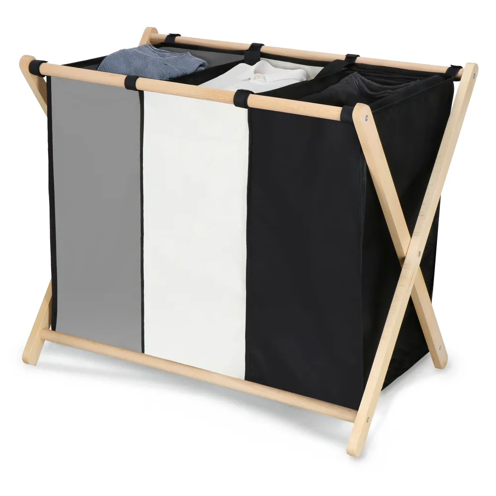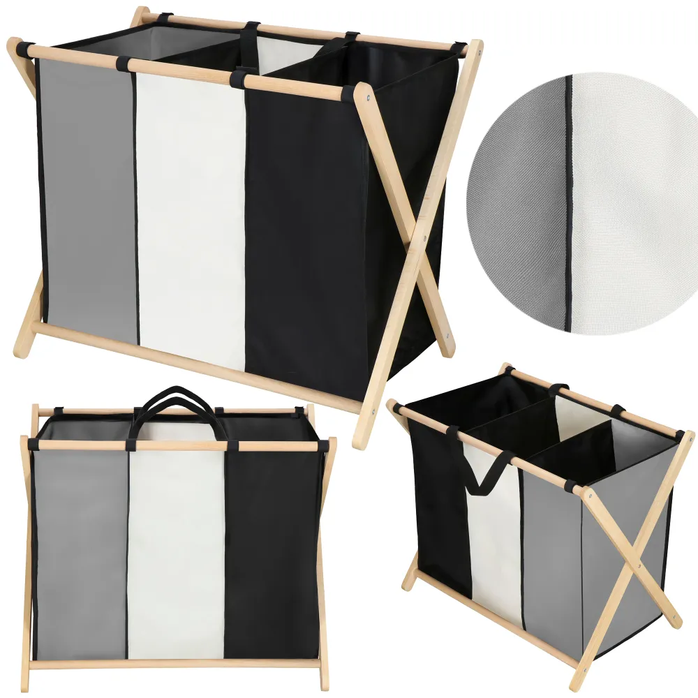 Praktický a štýlový práčovný kôš s tromi oddielmi uľahčuje triedenie špinavej bielizne vďaka farebnému rozlíšeniu jednotlivých priehradok. Jeho skladacia drevená konštrukcia šetrí miesto, keď ho nepoužívate, a textilné priehradky je možné ľahko vyprať. Kôš na špinavú bielizeň je vybavený praktickými pútkami pre pohodlné prenášanie. S celkovým objemom 105 litrov a rozmermi 67 x 41,5 x 57 cm ponúka dostatok priestoru na každodenné použitie. Ideálny pomocník do domácnosti, ktorý kombinuje funkčnosť a moderný design.