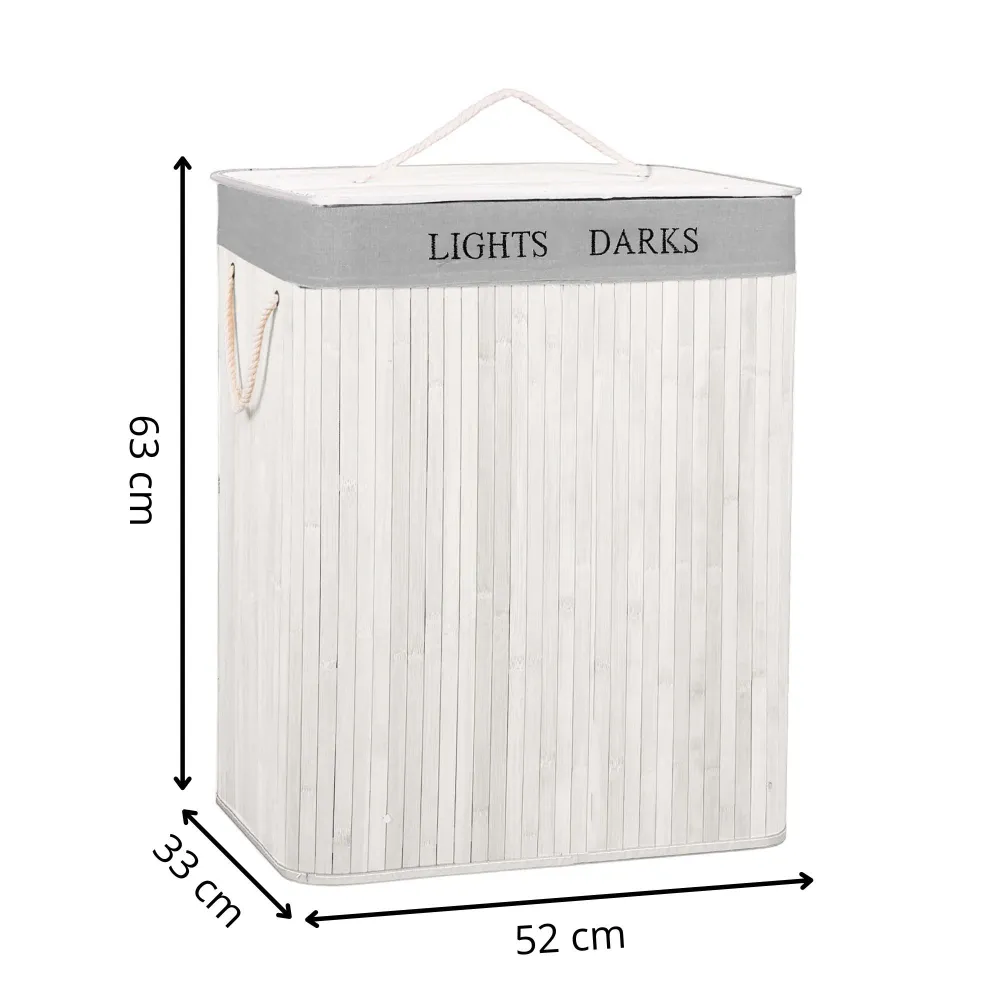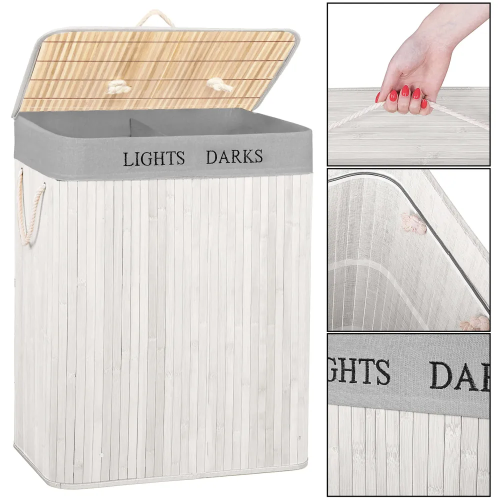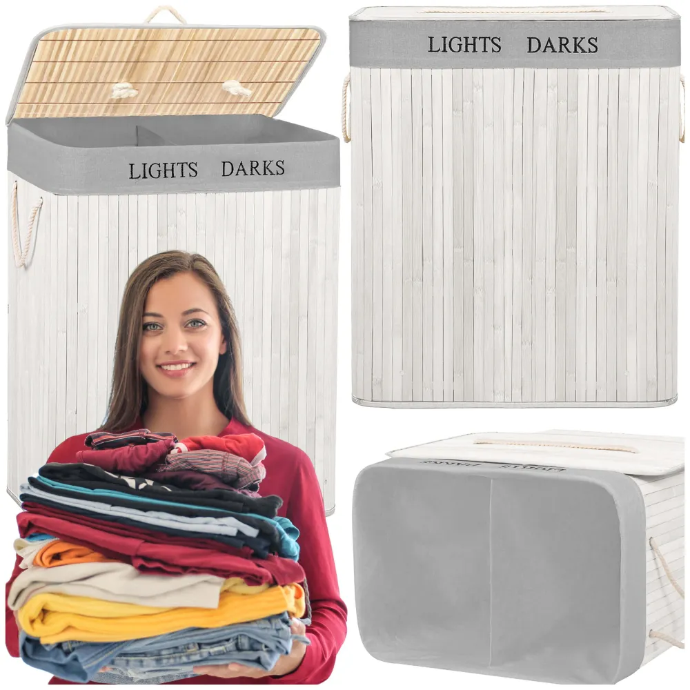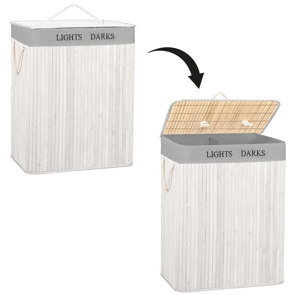 Štýlový dvojdielny kôš z bambusu a MDF umožňuje pohodlné triedenie bielizne vďaka dvom oddeleným sekciám. Disponuje vyberateľnou vnútornou taškou a ponúka veľkorysý objem 105 l. Kombinácia bielej a svetlo šedej farby, pevný kvádrový tvar a bočné šnúrky zaisťujú ľahkú manipuláciu aj elegantný vzhľad v každom interiéri.