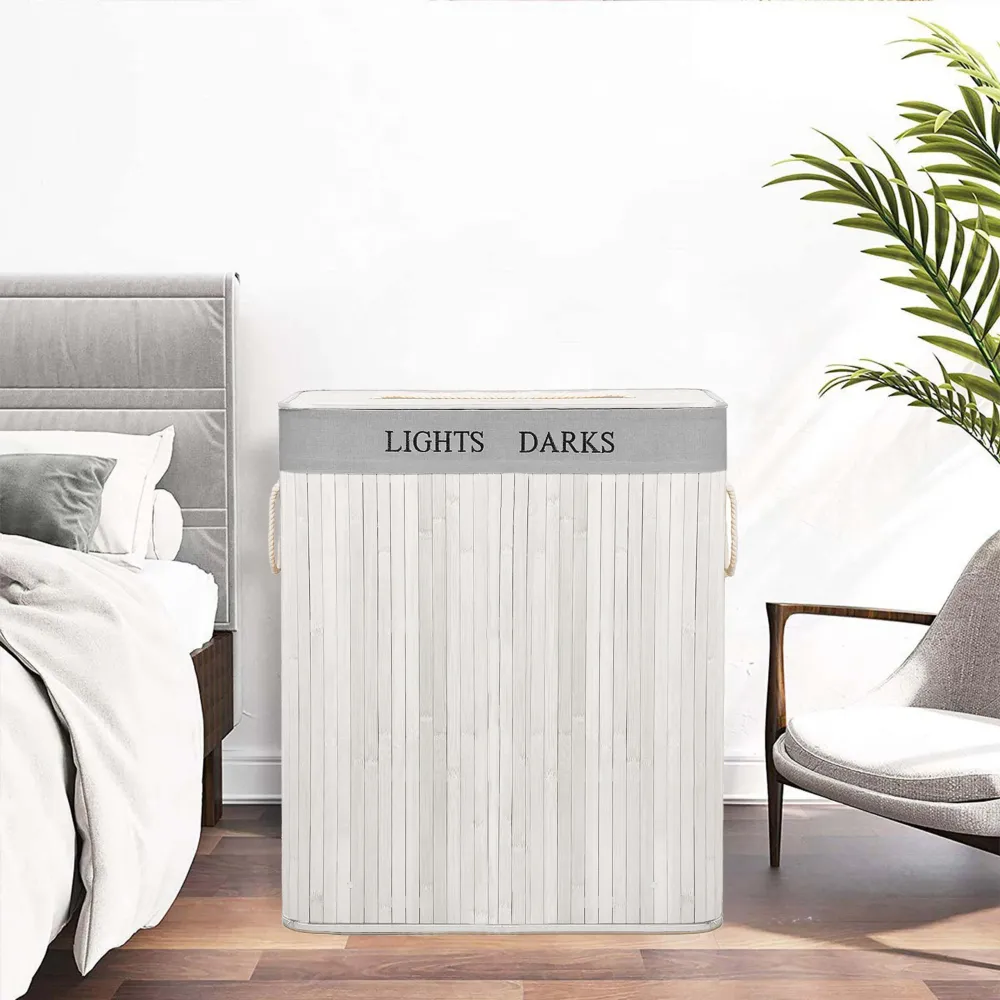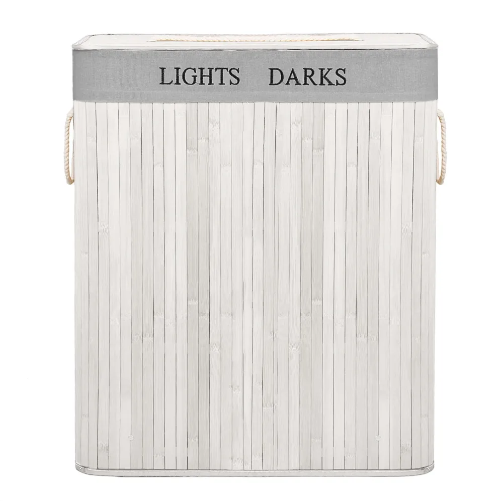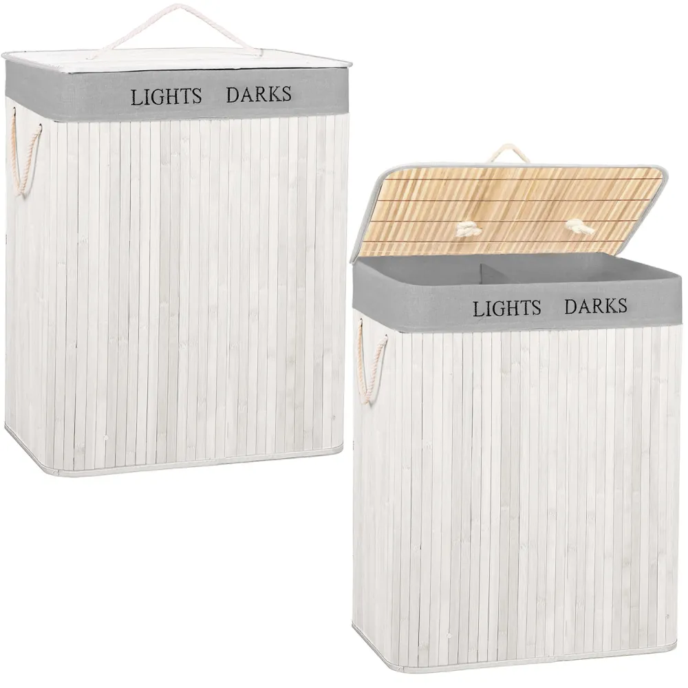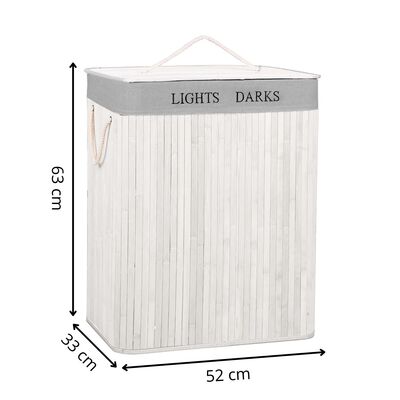 Štýlový dvojdielny kôš z bambusu a MDF umožňuje pohodlné triedenie bielizne vďaka dvom oddeleným sekciám. Disponuje vyberateľnou vnútornou taškou a ponúka veľkorysý objem 105 l. Kombinácia bielej a svetlo šedej farby, pevný kvádrový tvar a bočné šnúrky zaisťujú ľahkú manipuláciu aj elegantný vzhľad v každom interiéri.