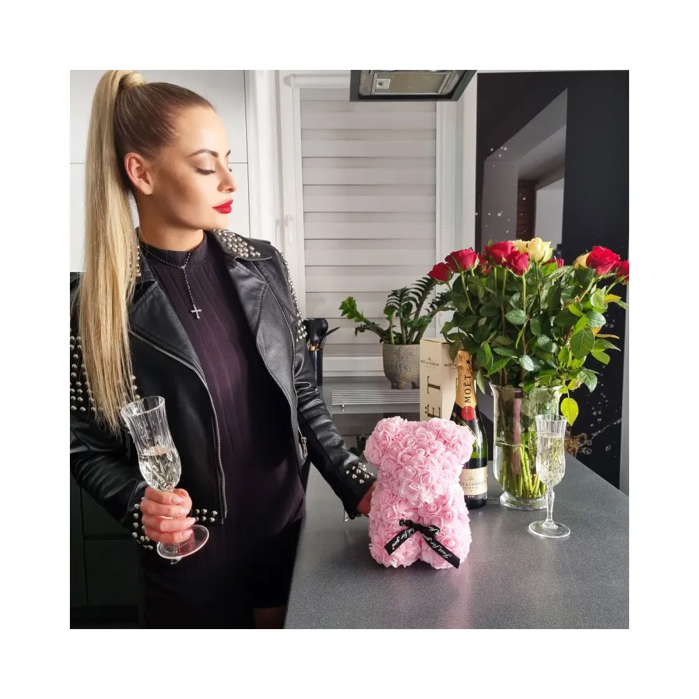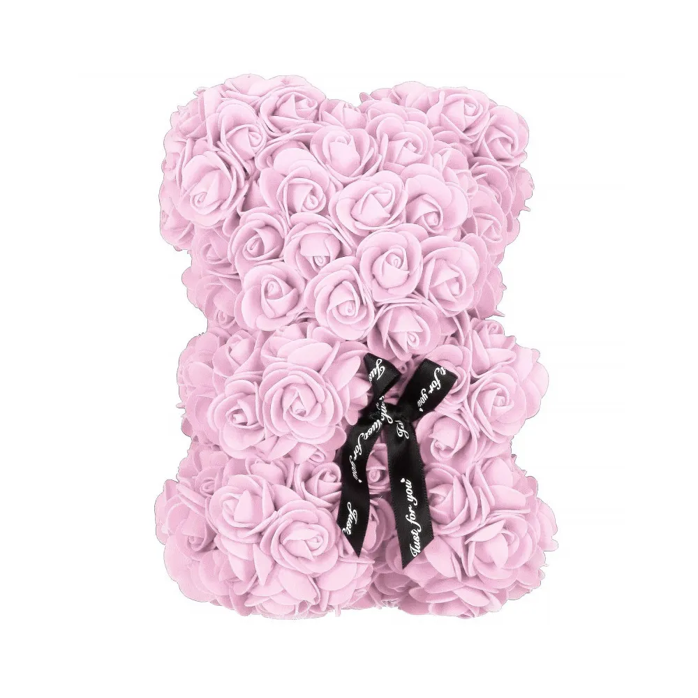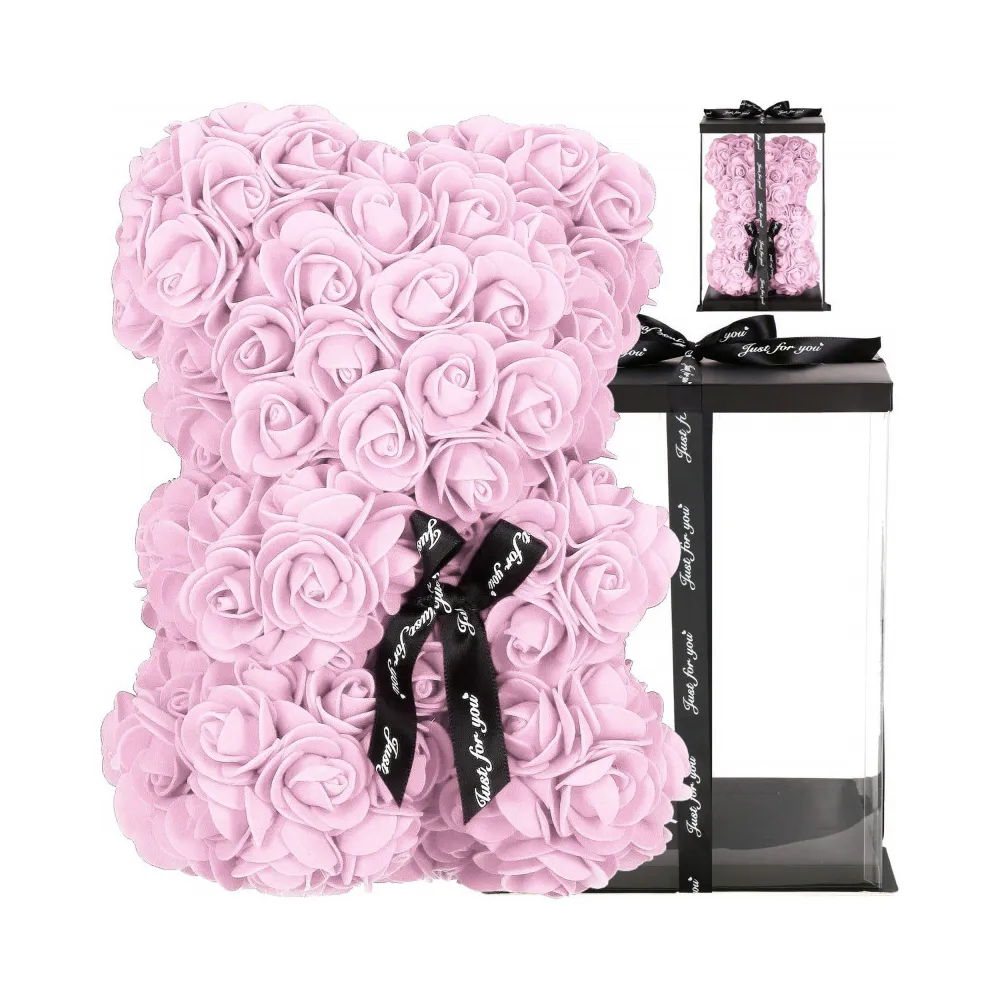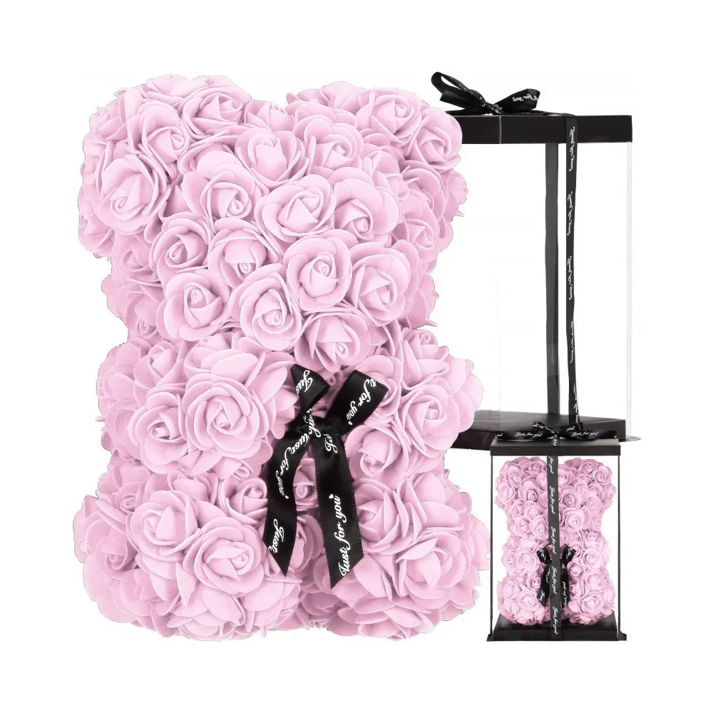 Perfektný darček pre ženy v jedinečnom spojení kvetín a roztomilého medvedíka. Teddy Rose nikdy nevädne a vydrží nadlho. Ručne vyrobený zo stoviek kvetov prémiových ruží, elegantne ozdobený jemnou mašličkou. Zabalený v luxusnej krabičke so stuhou. Vhodný ako darček k Valentínu pre milovanú osobu, štýlový darček k narodeninám alebo jedinečný darček k svadbe či výročiu.