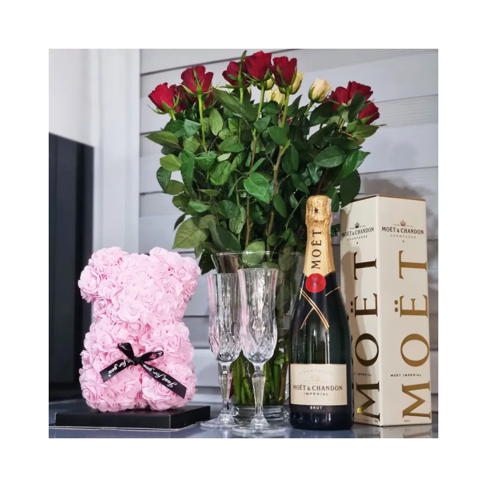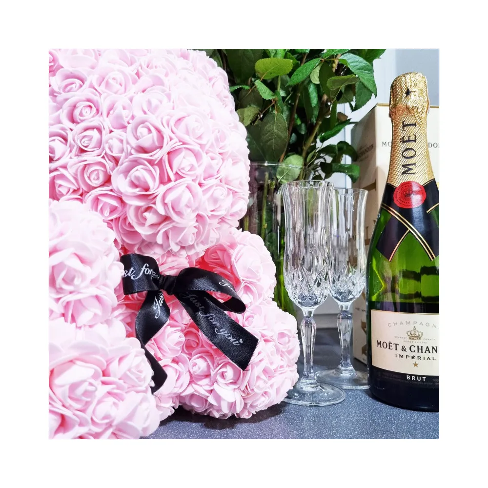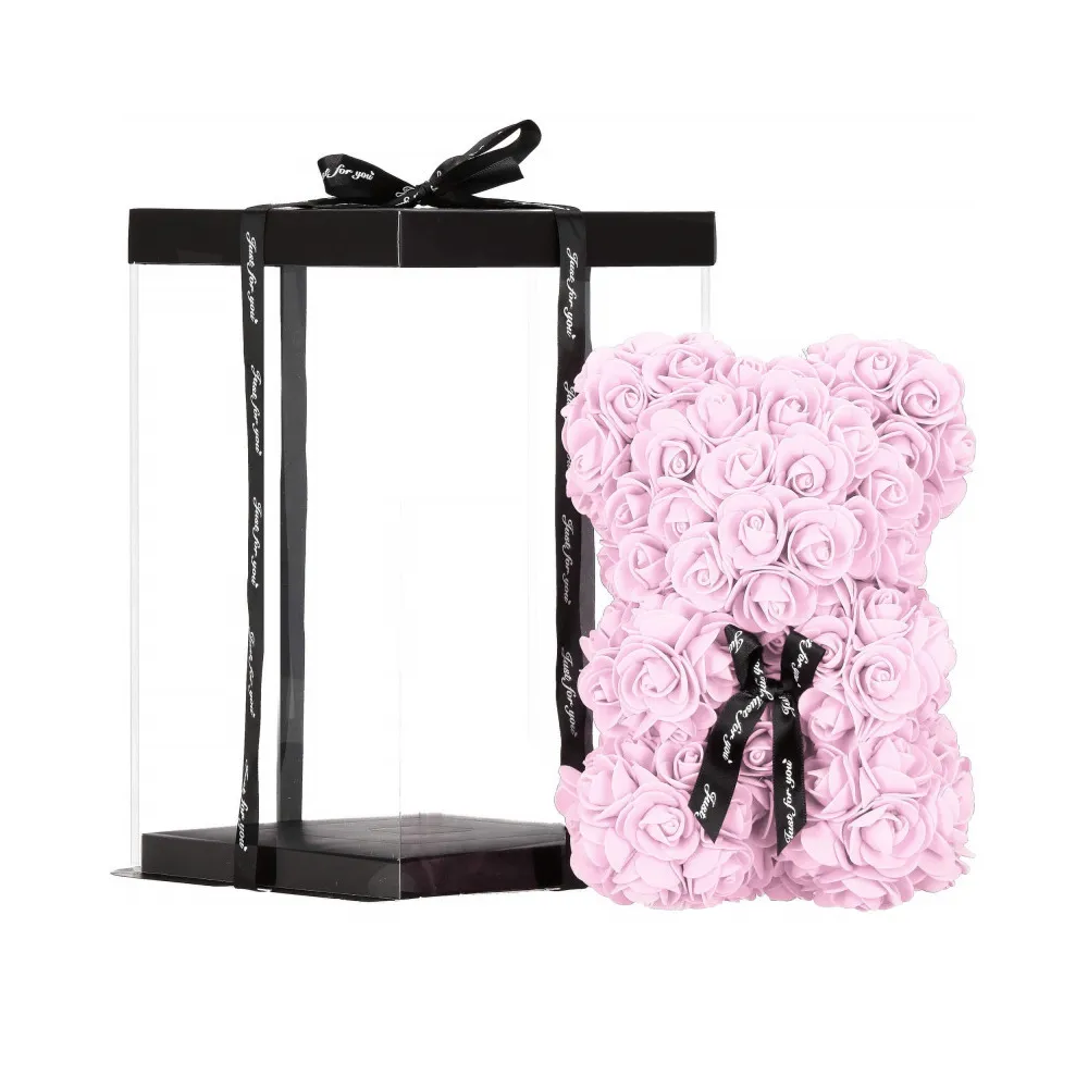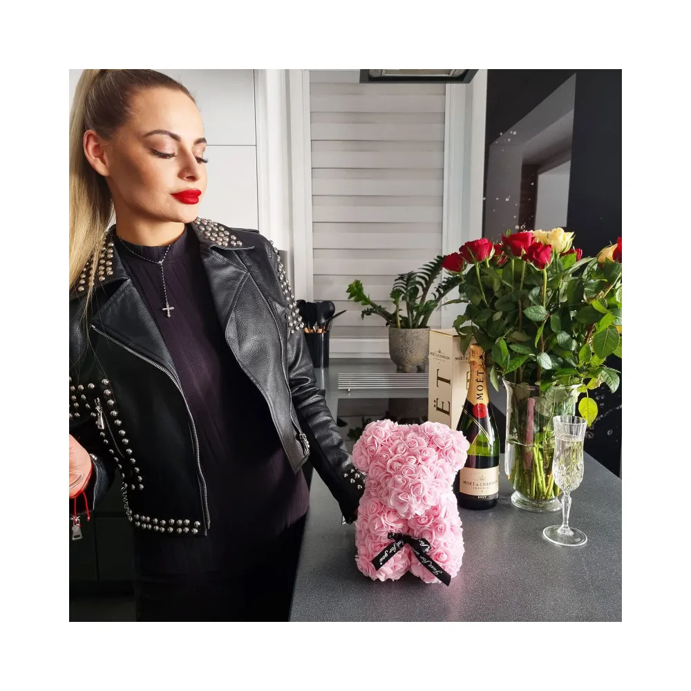 Perfektný darček pre ženy v jedinečnom spojení kvetín a roztomilého medvedíka. Teddy Rose nikdy nevädne a vydrží nadlho. Ručne vyrobený zo stoviek kvetov prémiových ruží, elegantne ozdobený jemnou mašličkou. Zabalený v luxusnej krabičke so stuhou. Vhodný ako darček k Valentínu pre milovanú osobu, štýlový darček k narodeninám alebo jedinečný darček k svadbe či výročiu.