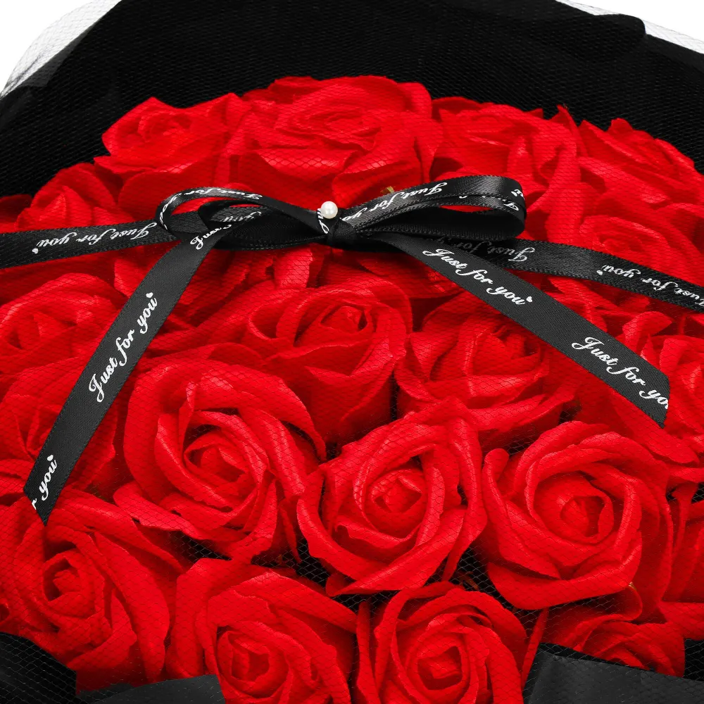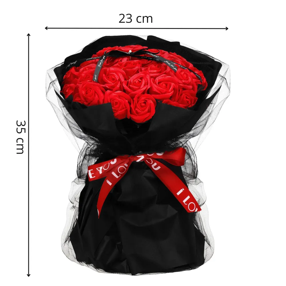 Mydlová kytica očarí svojim elegantným vzhľadom aj originálnym prevedením. Krásne mydlové ruže sú zabalené do čierneho papiera a tylu, previazané červenou stuhou. Mydlové kvety nielen úžasne vyzerajú, ale pri kontakte s vodou tiež penia, neuvädnú a nevyžadujú žiadnu starostlivosť. Ideálny darček pre každú príležitosť - zásnuby, narodeniny, Deň matiek, výročie a ďalšie, a navyše nespôsobujú alergie.