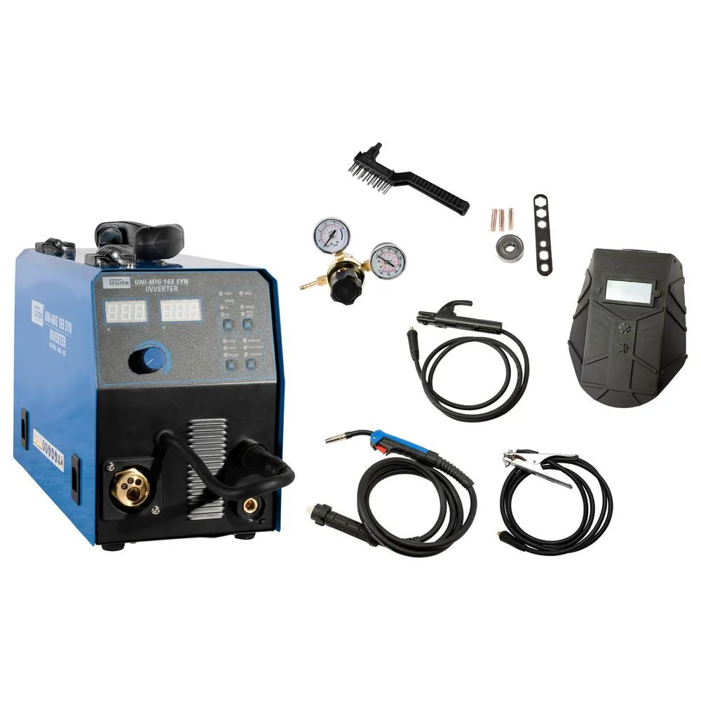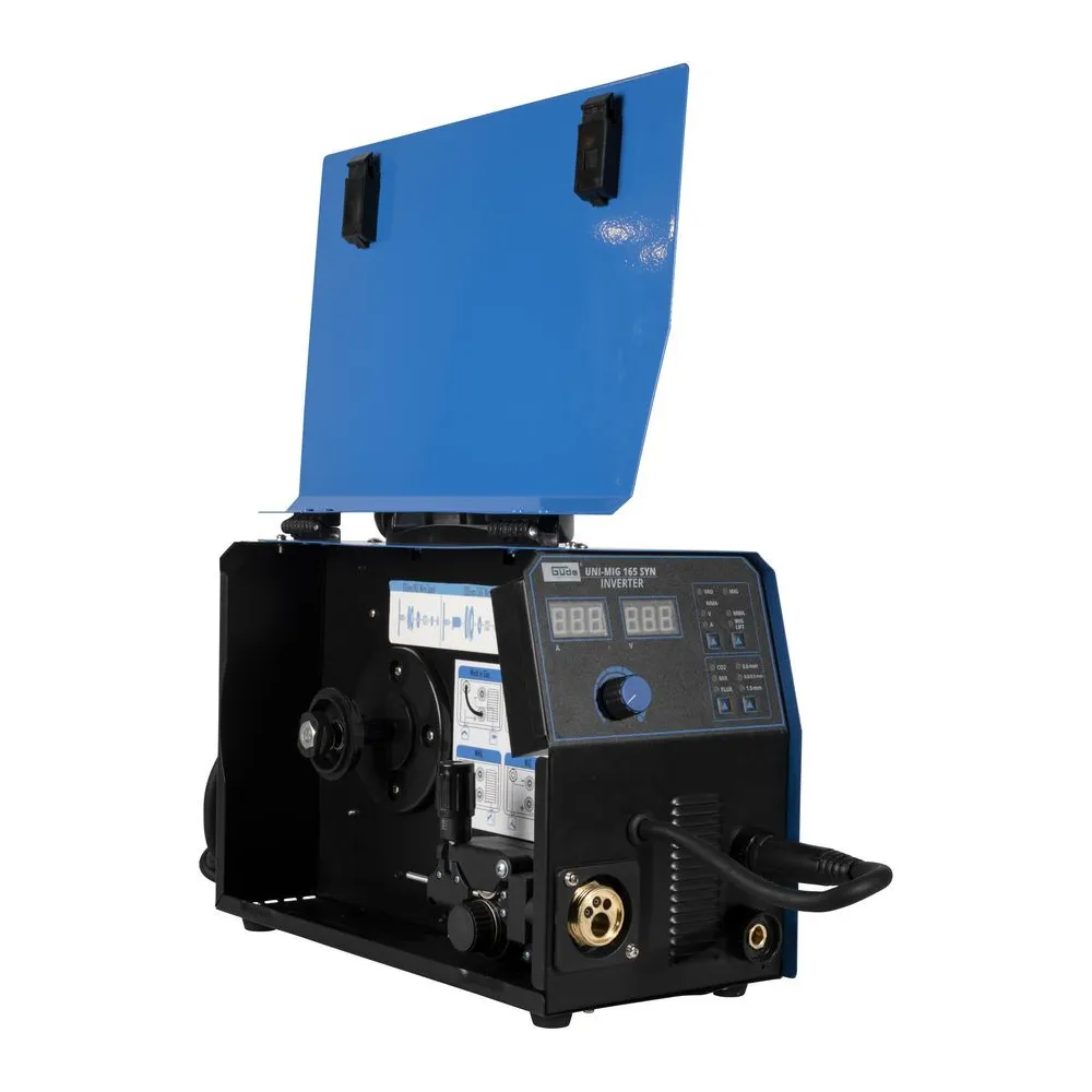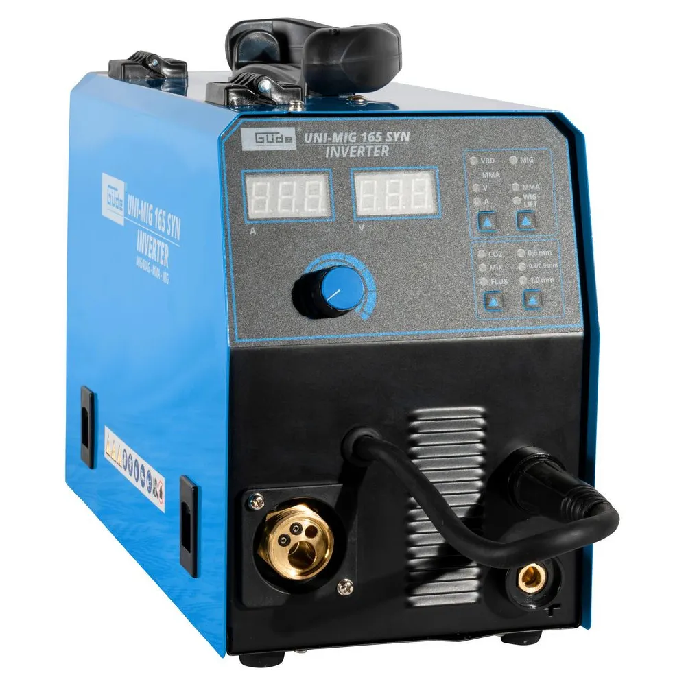 Invertorová zváračka Uni-Mig 165 SYN patrí medzi univerzálne invertorové zváračky v produktovom rade spoločnosti Güde. So zváračkou Uni-Mig 165 SYN sú možné prakticky všetky štyri zváracie procesy: MIG-MAG, MMA (zváranie elektródou), Flux (zváranie plneným drôtom) aj zváranie WIG (voliteľné). Osvedčené doplnkové vlastnosti ako Anti-Stick (zabraňuje prilepeniu elektródy k obrobku), Hot Start (pre optimálne zapaľovanie elektródy) a Arc Force (stabilizuje oblúk automatickým nastavením zváracieho prúdu a zaisťuje tak dokonalé výsledky zvárania) zaisťujú maximálny komfort pri zváraní, a to aj v náročných podmienkach. Nový, inovatívny synergicky regulovaný posuv drôtu sa po výbere procesu zvárania, hrúbky drôtu a sily zvárania automaticky nastaví na správnu rýchlosť. Tieto doplnkové funkcie umožňujú najmä začiatočníkom a neskúseným zváračom okamžite dosiahnuť dobré výsledky zvárania. Držiak elektród a ukostrovacia svorka, ako aj kladivo s kefou pre procesy MMA sú súčasťou štandardnej výbavy. To isté platí pre horák MIG/MAG a regulátor tlaku na ochranný plyn. Vhodná na malé cievky a plastové cievky D200 (5 kg). Kryt vyrobený z oceľového plechu s povrchovou úpravou práškovaním, tepelná ochrana proti preťaženiu. Trojmetrový hadicový zväzok s Euro prípojkou (MB15), 1,2-metrový uzemňovací kábel s ukostrovacou svorkou, 1,8-metrový držiak elektród. Prúdová tryska (0,8 mm), 1 plynová tryska. Dvojhodinový reduktor tlaku, plynová hadica. Vrátane zváračského štítu a kladiva na trosku s kefkou. Doba zapnutia pri maximálnom zváracom prúde 230 V (MMA/MIG/MAG/WIG): 30%.