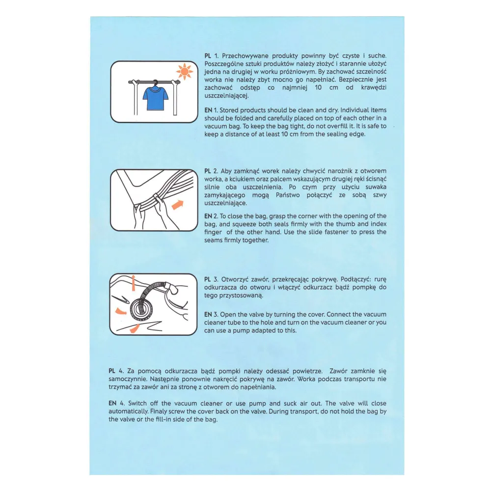 Široké zvary na okrajoch vám umožnia maximálne využiť priestor v taškách. Pevný, dvojitý povrázkový zámok bol špeciálne upravený na koncoch, aby sa zabránilo roztvoreniu. Zátka a ventil sú tesné a pasujú na rúrku vysávača a tiež na špeciálnu pumpu určenú pre tento typ sáčkov.