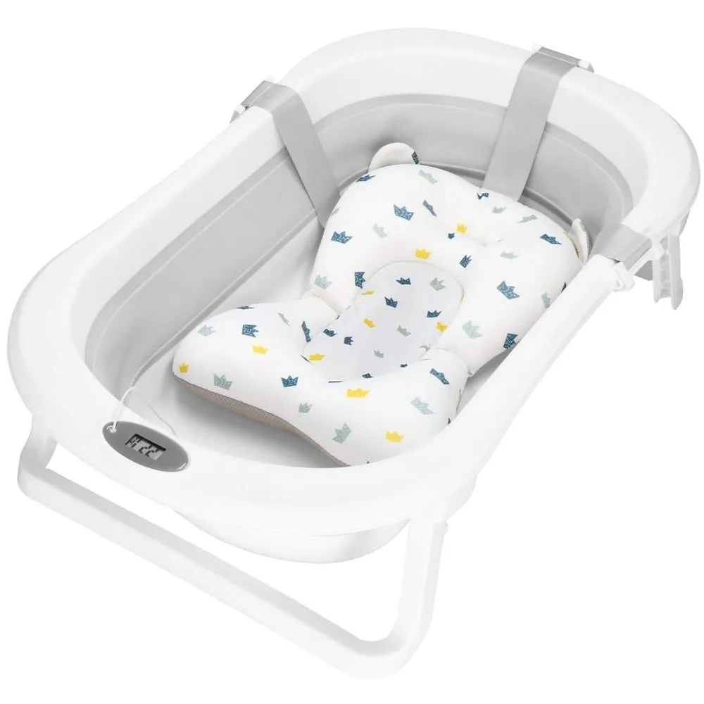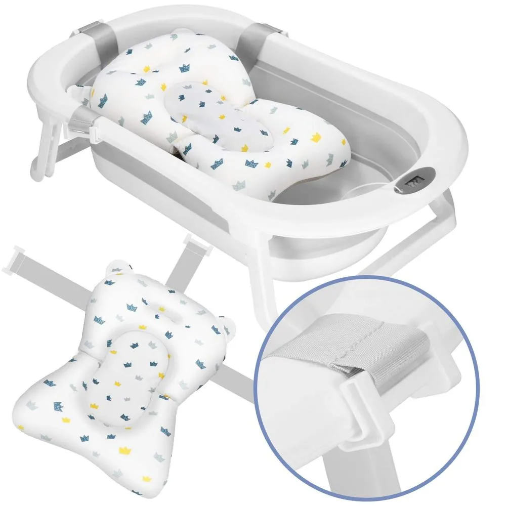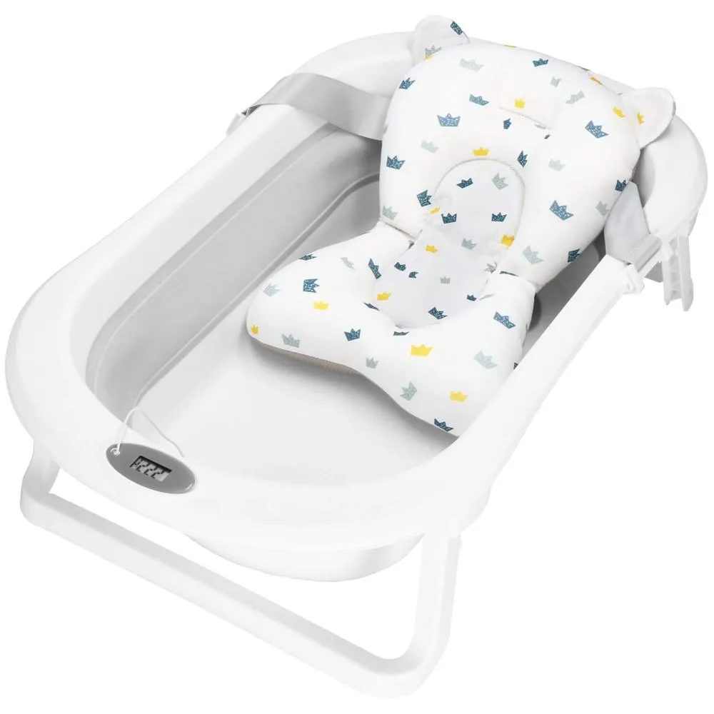 Skladacia vanička na kúpanie s teplomerom a ergonomickou podložkou zaistí pohodlné a bezpečné kúpanie bábätka. Vanička pre novorodencov má zabudovaný LCD teplomer s presnosťou 0,1 ° C a teplotné čidlo s dlhým káblom. Odtok so zátkou mení farbu podľa teploty vody. Mäkký vankúš s polystyrénovou výplňou sa prispôsobí detskému telu a upevňovacie popruhy ho pevne držia. Ľahká detská vanička sa ľahko skladá, má protišmykový stojan a je ideálna na cesty aj do malých kúpeľní.