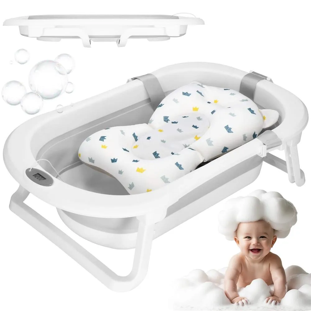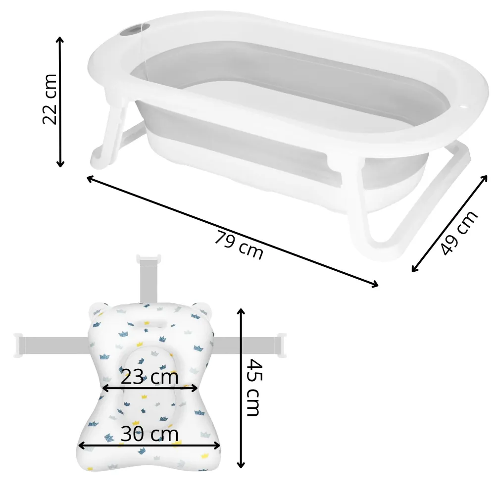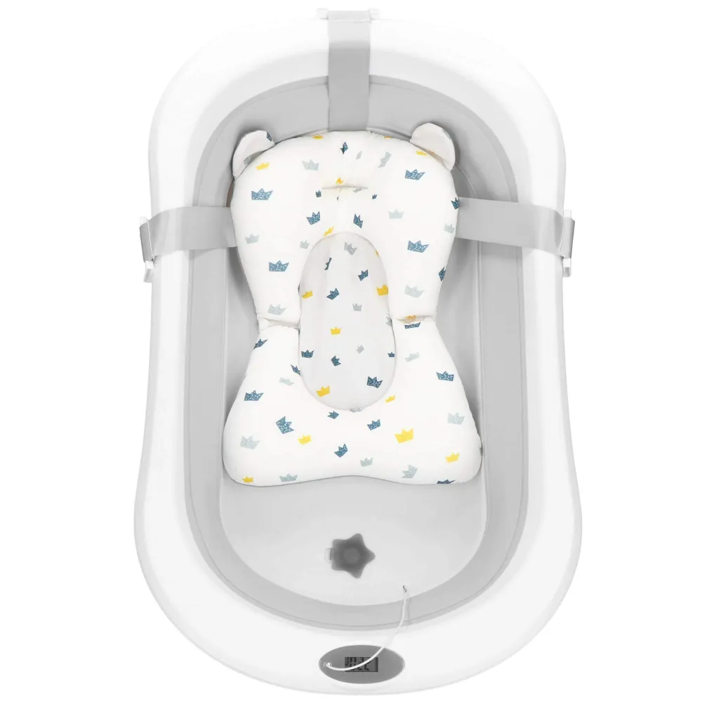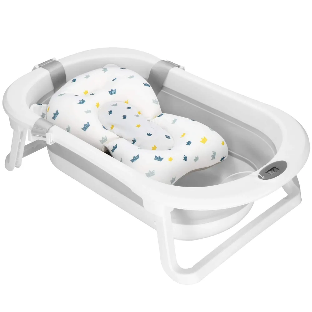 Skladacia vanička na kúpanie s teplomerom a ergonomickou podložkou zaistí pohodlné a bezpečné kúpanie bábätka. Vanička pre novorodencov má zabudovaný LCD teplomer s presnosťou 0,1 ° C a teplotné čidlo s dlhým káblom. Odtok so zátkou mení farbu podľa teploty vody. Mäkký vankúš s polystyrénovou výplňou sa prispôsobí detskému telu a upevňovacie popruhy ho pevne držia. Ľahká detská vanička sa ľahko skladá, má protišmykový stojan a je ideálna na cesty aj do malých kúpeľní.