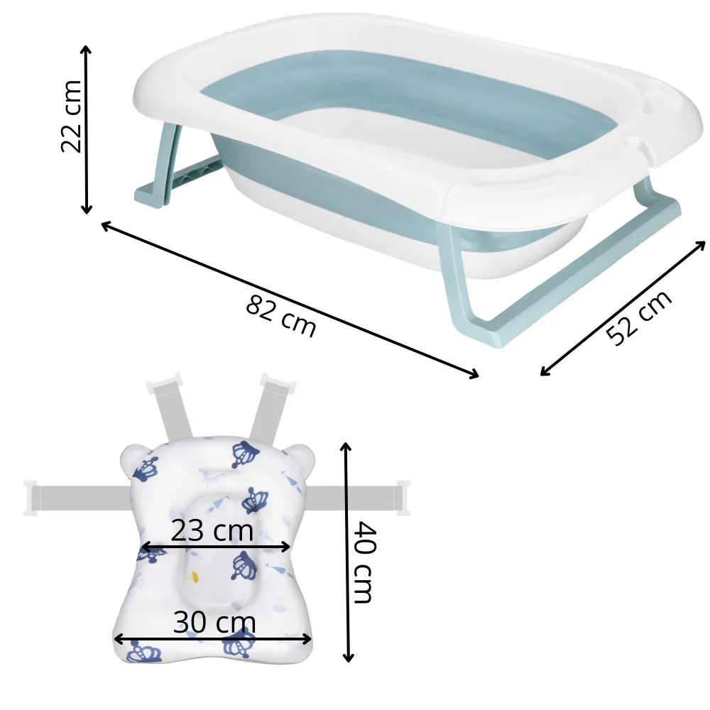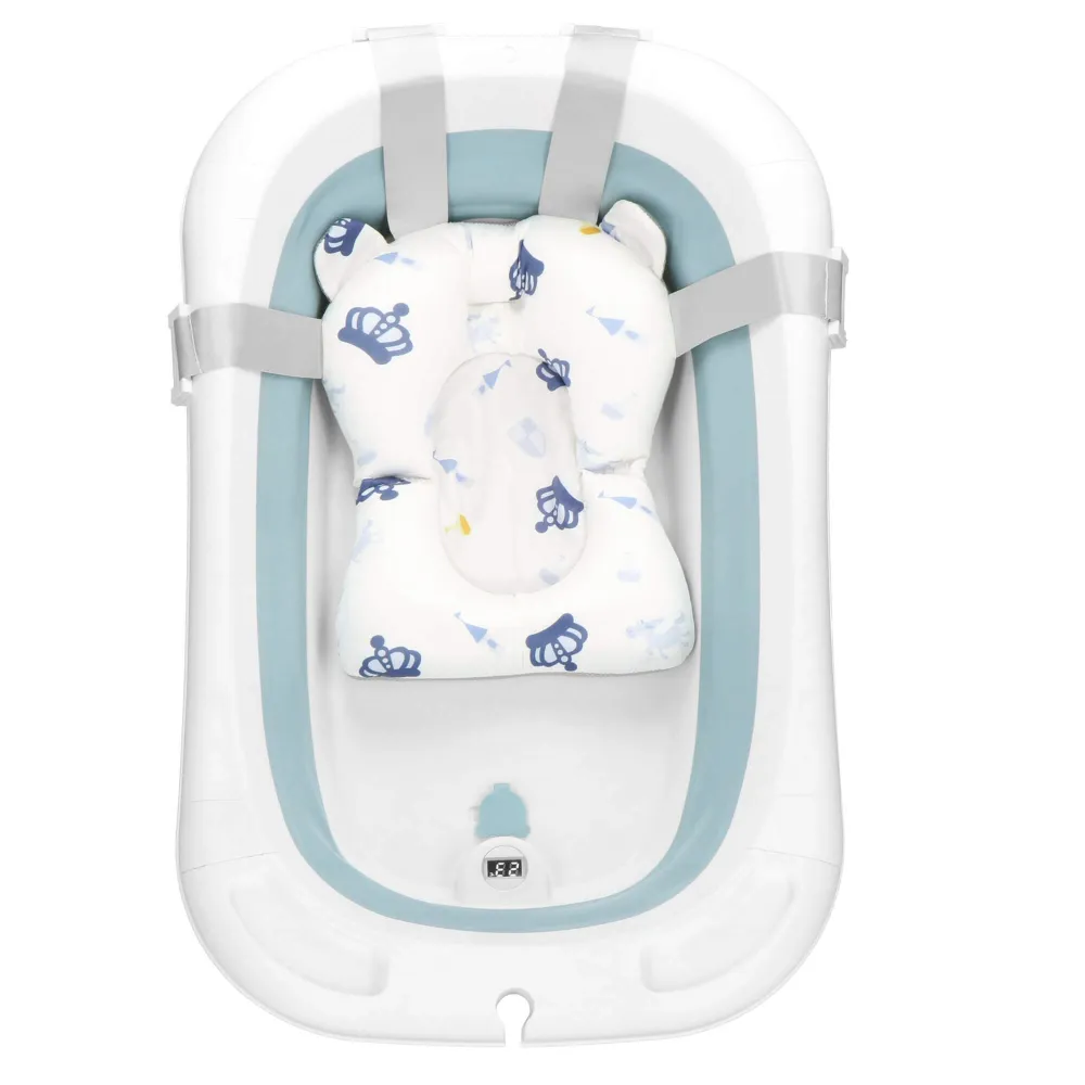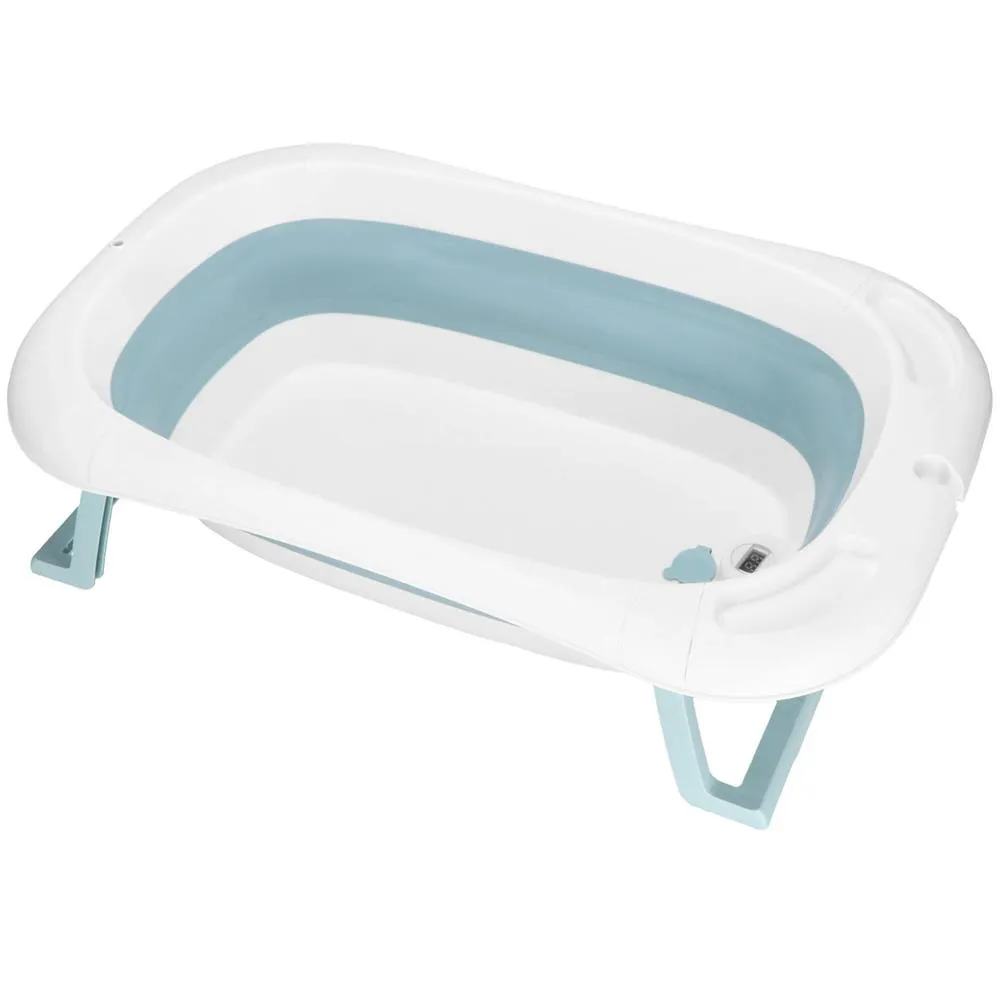 Skladacia vanička na kúpanie s teplomerom a ergonomickou podložkou zaistí pohodlné a bezpečné kúpanie bábätka. Vanička pre novorodencov má zabudovaný svietiaci LCD teplomer s presnosťou 0,1 °C. Odtoková sa zátka naspodku vaničky pre ľahké vylievanie. Mäkký vankúš s polystyrénovou výplňou sa prispôsobí detskému telu a upevňovacie popruhy ho pevne držia. S otvorom na umiestnenie sprchovej hlavice pre ľahké napúšťanie. Ľahká detská vanička sa ľahko skladá, má protišmykový stojan a je ideálna na cesty aj do malých kúpeľní.