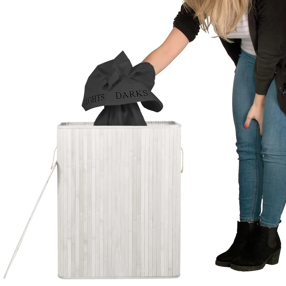 Základné údaje Značka: Springos®. Materiál: bambus, MDF. Plátno: 53% polyester, 30% bavlna, 17% viskóza. Farba: biela. Farba materiálu: tmavo šedá. Tvar: kváder. Košík rozdelený na dve časti. Rozmery: Maximálna výška: 63 cm. Výška bez zapínania: 62,5 cm. Maximálna šírka: 52 cm. Maximálna hĺbka: 33 cm. Bočné šnúrky: 17 x 1 cm (dĺžka x hrúbka). Jedna sekcia: 26 x 33 cm. Objem: 105 l. Ďalšie informácie: Produkt pre svojpomocnú montáž podľa priloženého návodu. Ručné pranie pri maximálnej teplote 30 °C.