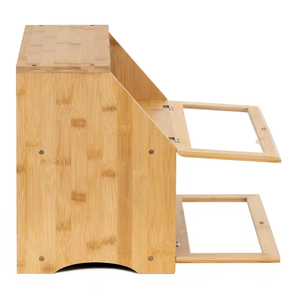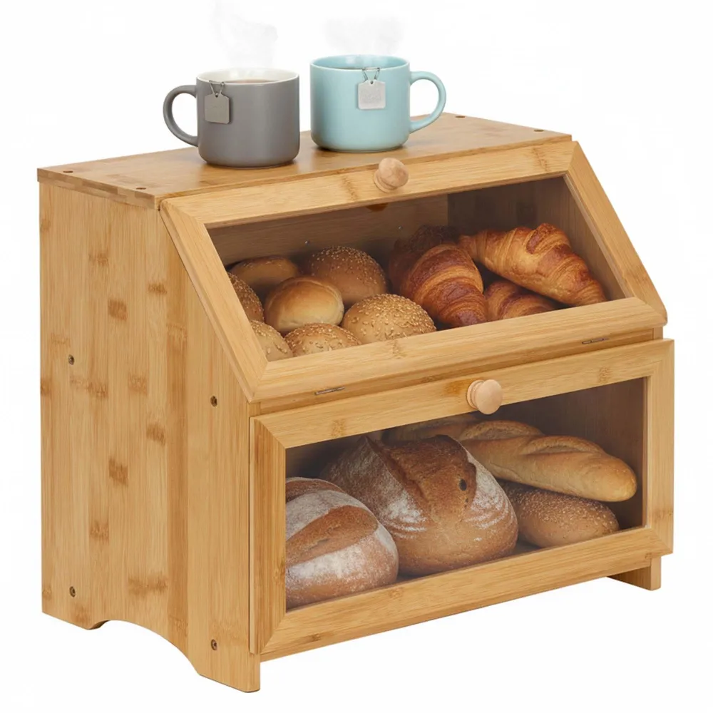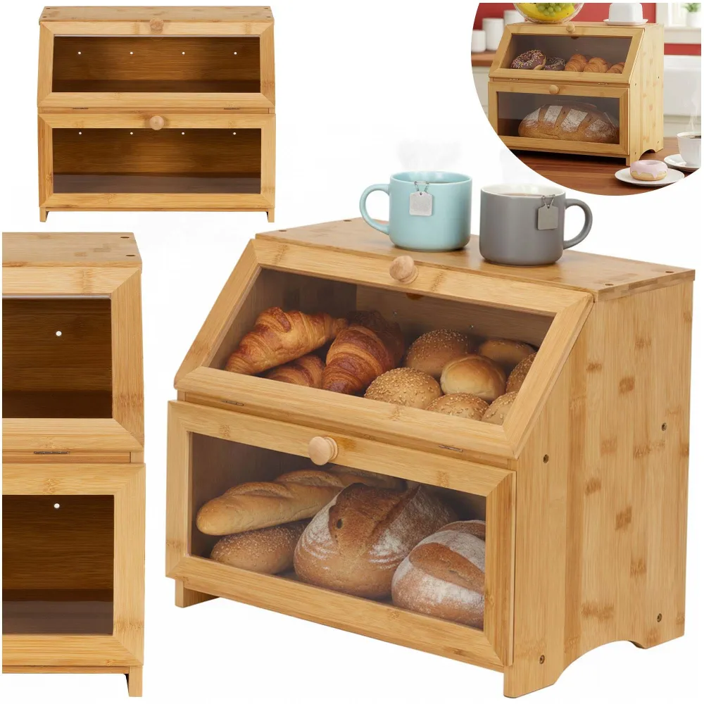Základné údaje: Značka: Springos®. Farba: prírodný bambus, odtiene hnedej. Materiál: bambus, priehľadný akryl. Rozmery: Celková šírka: 39 cm. Celková hĺbka: 25 cm. Celková výška: 32 cm. Hrúbka hrán: 1 cm. Šírka okien: 34 cm. Výška okien: 11 cm. Priemer rukovätí: 2,5 cm. Hrúbka rukoväte: 1,5 cm. Vnútorné rozmery políc: 37 x 22 x 1 cm. Vnútorná výška spodnej police: cca 15,5 cm. Vnútorná výška hornej police: cca 11,5 cm. Šírka bočných rukovätí: 12 cm. Výška bočných úchytov: 2 cm. Ďalšie informácie: Po stranách chlebníka sú umiestnené zárezy, ktoré slúžia ako rukoväte pre uľahčenie prepravy výrobkov. Magnetický zatvárací systém. Výrobok schválený pre styk s potravinami. Produkt pre svojpomocnú montáž. Montážna sada je súčasťou ZADARMO.