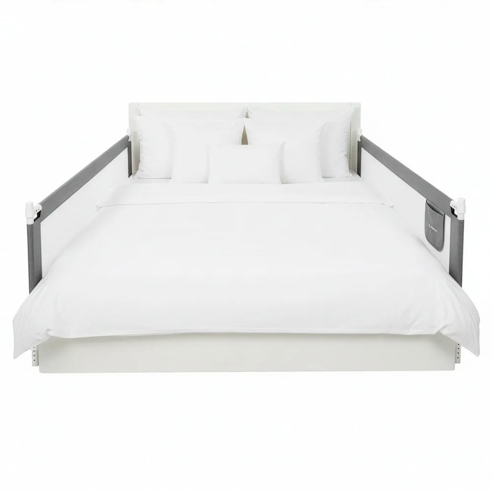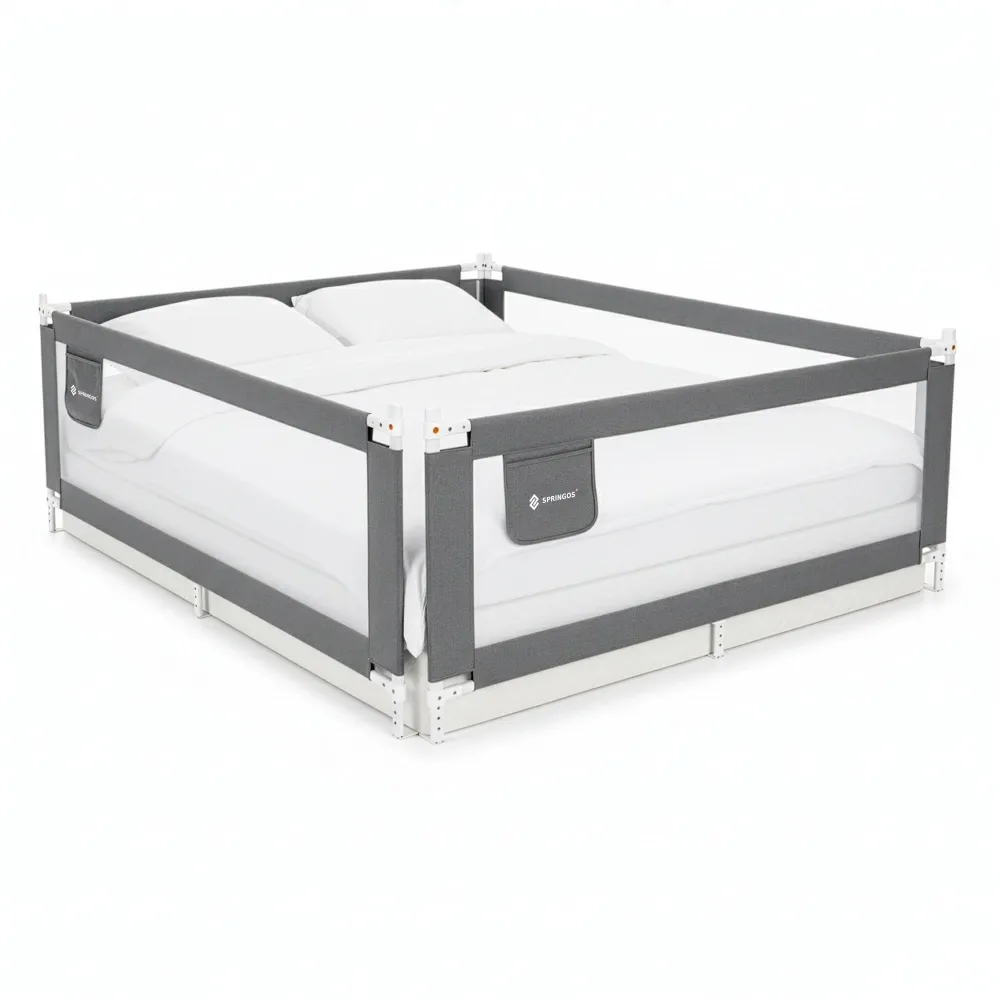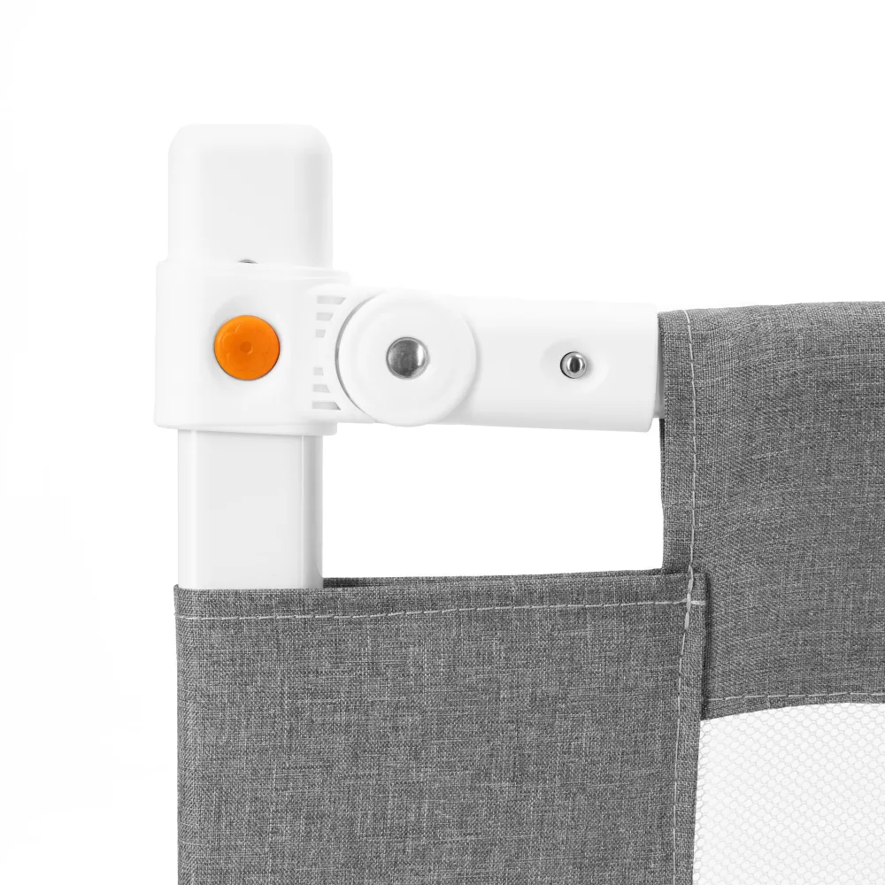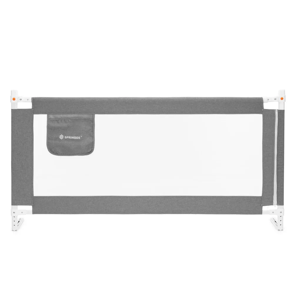 Základné údaje: Značka: Springos®. Farba: šedá, biela. Materiál rámu: nerezová oceľ. Materiál látky: 100% nylon. Materiál spojovacích prvkov: plast. Hrúbka látky: 210D Oxford. Nastaviteľná výška. Šité vrecko. Certifikát: CE. Rozmery: Celková šírka: 158 cm. Minimálna výška: 74,5 cm. Maximálna výška: 94,5 cm. Nastavenie výšky: cca 2 cm. *Výška meraná s vloženými podperami Celková hrúbka: cca 2,5 cm. Šírka látky: 157 cm. Výška látky: 68 cm. Hrúbka látky: 0,6 cm. Šírka ôk: 131 cm. Výška ôk: 48 cm. Rozsah nastavenia látky hore-dole: 12 - 68 cm. Hrúbka peny: cca 1 cm. Šírka zvislých profilov rámu: 3,5 cm. Hrúbka zvislých profilov rámu: 1,5 cm. Šírka horizontálnych profilov rámu: 2,5 cm. Hrúbka vodorovných profilov rámu: 1 cm. Priemer gombíka: 1,5 cm. Výška vrecka: 23 cm. Šírka vrecka: 25 cm. Hĺbka vrecka: cca 9 cm. Rozmery otvoru v rohoch zábrany: cca 8,5 x 3,5 (šírka x výška). Dĺžka zipsu: 55 cm. Podporuje. Výška tyče: 27 cm. Šírka tyče: 3 cm. Hrúbka tyče: 1 cm. Dĺžka podpornej nohy: 25...